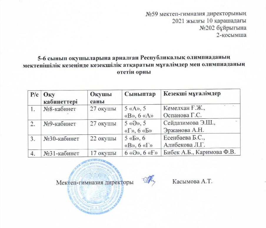 "№59 мектеп-гимназиясының 5-6 сынып оқушыларына арналған Республикалық олимпиаданың мектепшілік кезеңін өткізу туралы" бұйрық негізінде олимпиада "Алматы дарыны" ДБМТЖАҚЖТО-ның барлық ережелеріне сәйкес өткізілді.
