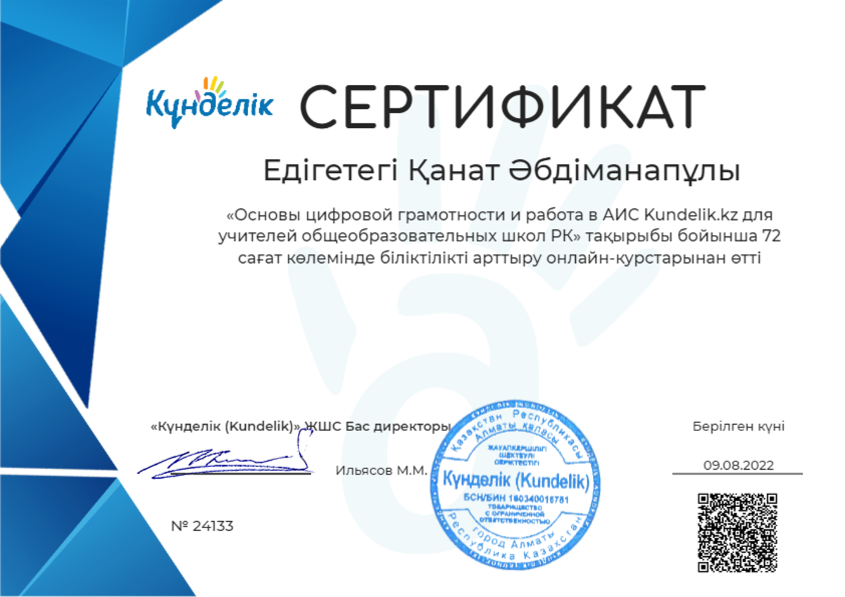12 август 2022 0 1 2 3 4 5 Цифрлық сауаттылық бойынша онлайн курстан өтті. Осы аптада мектеп мұғалімдері цифрлық сауаттылық негіздері бойынша 72 сағат көлемінде біліктілікті арттыру онлайн-курсынан өтті.