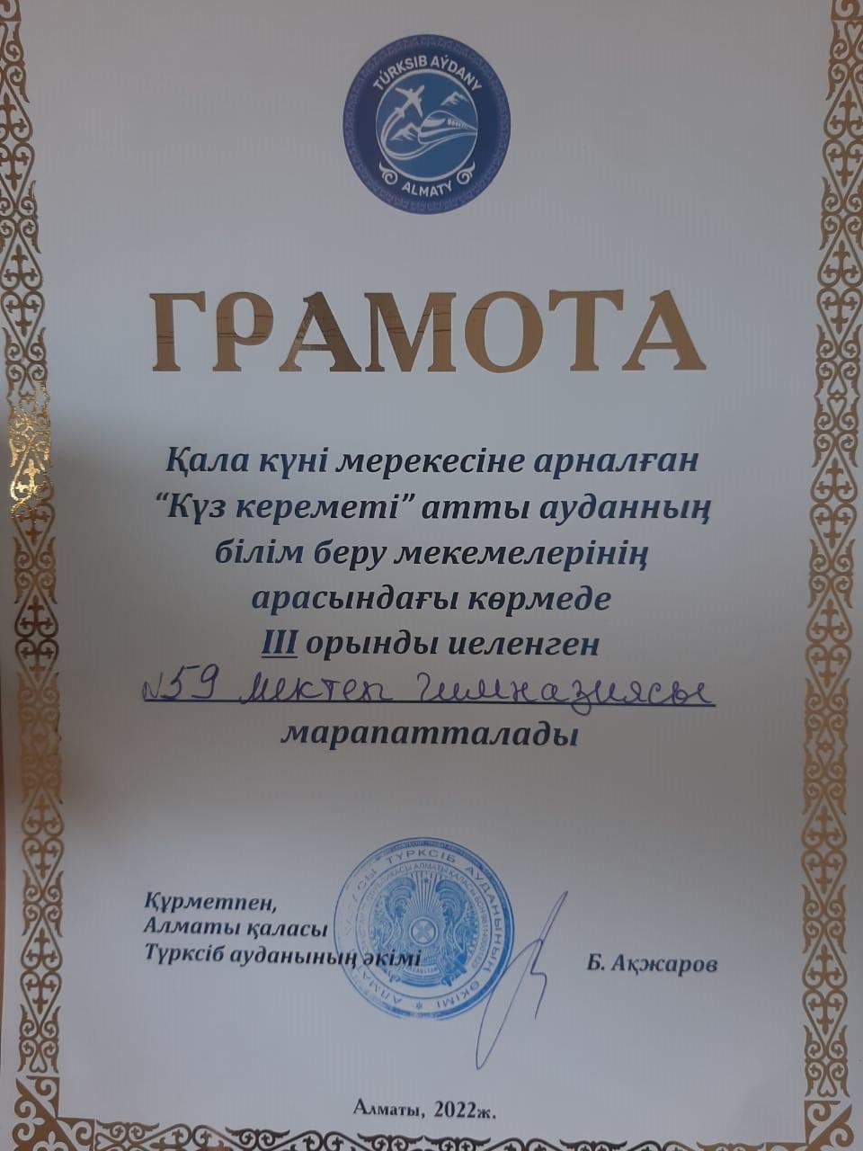 Осы аптаның сенбісінде Түрксіб ауданына қарасты Сейфуллин саябағында Қала күні мерекесіне орай "Күз кереметтері " тақырыбында көрме ұйымдастырылды. Көрмеге аудан бойынша 27 мектеп өз жұмыстарын көрсетіп, жүлделі орындарға ие болды. Соның ішінде мектебіміздің оқушылары түрлі жеміс-көкөністерден әртүрлі заттар жасап, аудан бойынша жүлделі ІІІ орынға ие болды. Жауапты: директордың тәрбие ісі жөніндегі орынбасарлары- Д. Кыпшакова, Д.М. Әлімжан және көркем еңбек пәні мұғалімдері- Г. Бижан, А.Ұзақбаева, Д.Сақабай, А.Сауат.