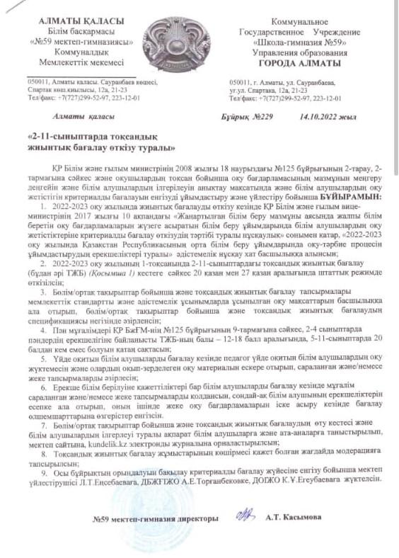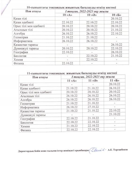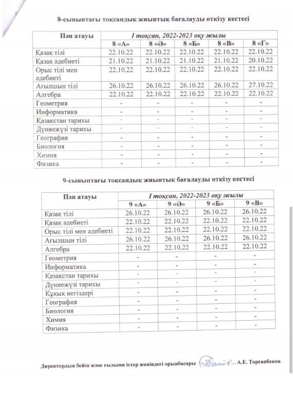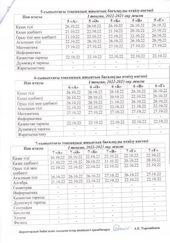 Тоқсандық жиынтық бағалау 20-27.10.2022 аралығында өткізіледі.