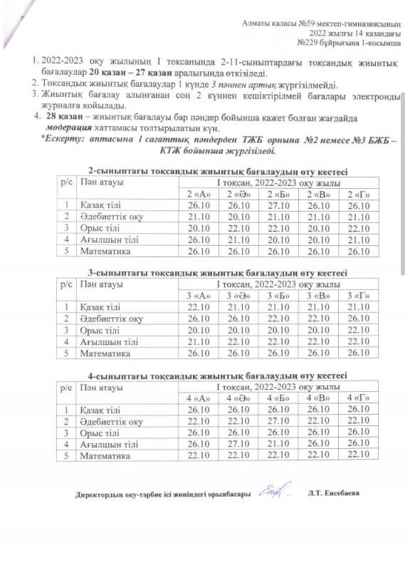 2022-2023 оқу жылының 1-тоқсанында жиынтық бағалауы бар пәндер бойынша 2-11-сыныптарға арналған ТЖБ (тоқсандық жиынтық бағалау) өткізу кестесі.