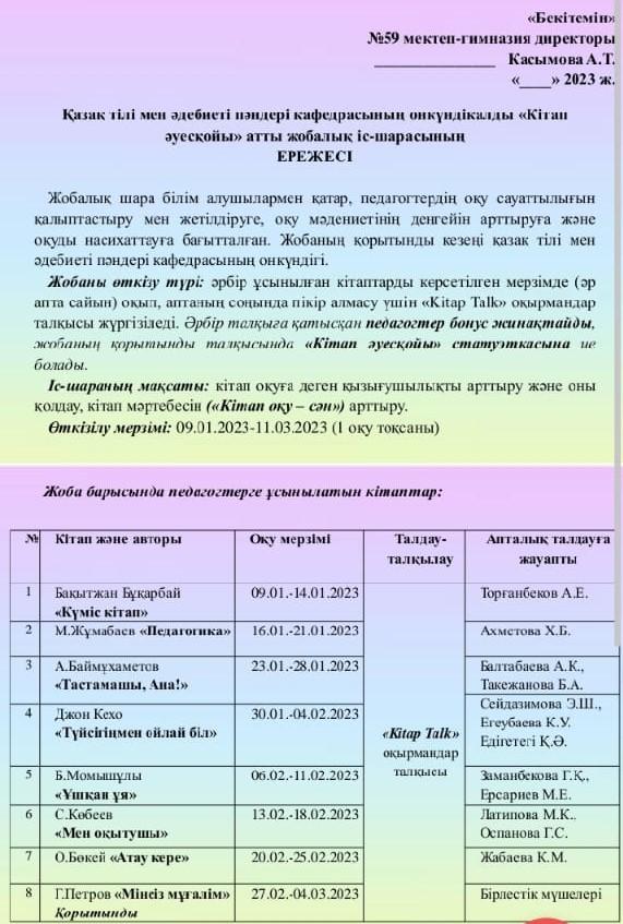 Қазақ тілі мен әдебиеті пәндері кафедрасының онкүндікалды «Кітап әуесқойы» атты жобалық іс-шарасы қолға алынды. Жоба педагогтер арасында кітап оқуға бағытталып отыр. Жобалық шара білім алушылармен қатар, педагогтердің оқу сауаттылығын қалыптастыру мен жетілдіруге, оқу мәдениетінің деңгейін арттыруға және оқуды насихаттауға бағытталған. Осы ретте Қазақ тілі мен әдебиеті пәндері кафедрасы мектеп мұғалімдерін қазақстандық және шет елдік танымал авторлардың кітаптарын оқып, «Кітап әуесқойы» атануға шақырады.