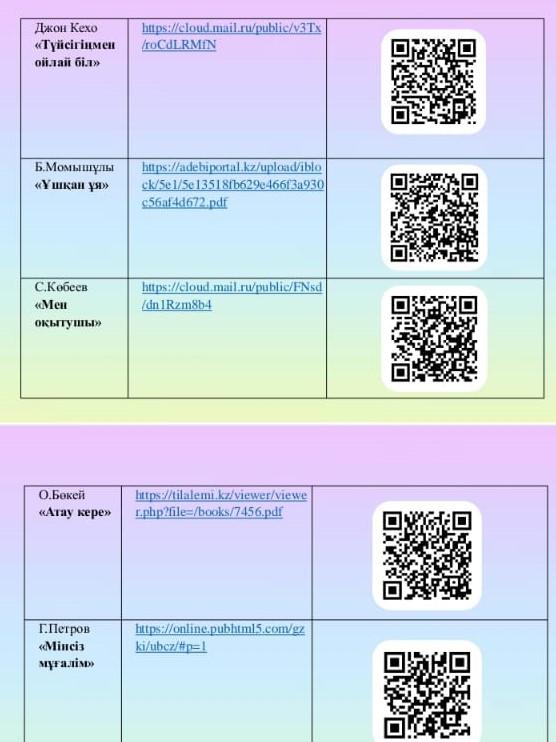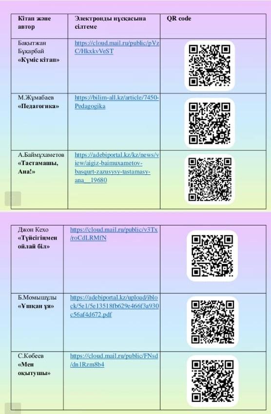 Оқуға ұсынылған шығармалардың электронды нұсқасына сілтеме мен QR code қосымша ұсынылған.