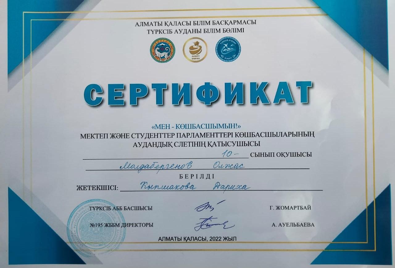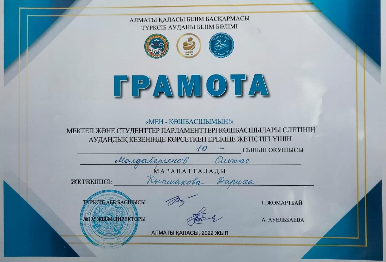 Мектеп оқушыларының өзін-өзі басқару ұйымының президенті, белсенді баламыз Молдабергенов Олжас «Мен – көшбасшымын» мектеп және студенттер парламенттері көшбасшылары слетінің аудандық кезеңінде көрсеткен ерекше жетістігі үшін грамотамен марапатталып, мектебіміздің мерейін тағы асырып отыр. Баламызға, «Жарайсың!» деп игі тілек білдіреміз. Мектебіміздің президенті, көптеген игілікті шаралардың ұйытқысы Олжас Молдабергенов өткен жылы көптеген дауыспен президент болып, аз ғана уақытың ішінде біраз байқаулар мен іс-шараларға қатысып үлгерген еді. Енді міне, ерекше жетістігі үшін грамотамен және сертификатпен марапатталып, биіктен көрініп отыр. Осы ретте Олжас баламыздың жетекшісі, директордың тәрбие ісі жөніндегі орынбасары Кыпшакова Дариха апайымызға осындай балаларға жетекшілік жасап, бағыт-бағдар беріп жүргеніне ризашылық сезімімізді білдіре отырып, оқу-тәрбие ісіндегі жұмыстарына мол табыстар тілейміз.