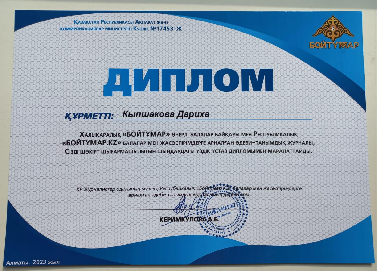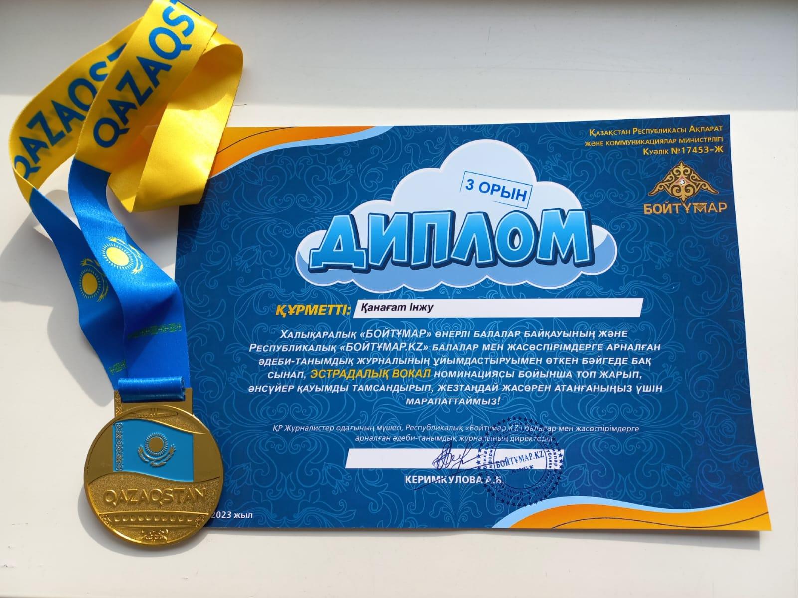 Халықаралық "Бойтұмар" өнерлі балалар байқауы мен Республикалық "Бойтұмар kz" балалар мен жасөспірімдерге арналған әдеби-танымдық журналы ұйымдастырған байқауда мектебіміздің 4-сынып оқушысы Қанағат Інжу бақ сынасып, «Эстрадалық вокал» номинациясы бойынша топ жарып, 3-орынға ие болды. «Жарайсың!» дейміз. Сонымен бірге Қанағат Інжудің жетекшісі Кыпшакова Дариха апай шәкірт шығармашылығын шыңдаудағы зор еңбегі үшін «Үздік ұстаз» деген дипломмен марапатталып, ҚР Журналистер Одағының мүшесі, Республикалық "Бойтұмар kz" балалар мен жасөспірімдерге арналған әдеби-танымдық журналының директоры А.Б.Керимкулованың алғысына бөленді. Біз де әріптесімізге «Құтты болсын!» дей отырып, өнерлі шәкірттерді дайындаудағы еңбектеріңіз жемісті бола берсін деген тілек білдіреміз.