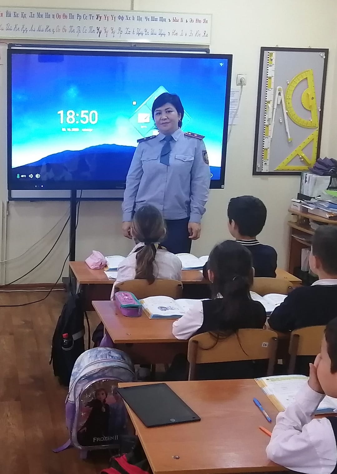 Бүгін № 59 мектеп-гимназиясының 3-4 сынып оқушыларымен Алматы 2 ст. ЖПб бастығы, полиция майоры А.З.Аитов, Алматы 2 ст. ЖПб ӘПТ инспекторы, полиция майоры Д.О.Жетпісбайдың және Алматы 1 ст. ЖПБ ӘПб аға инспекторы, полиция майоры А.Ақмолдаеваның, №59 мектеп-гимназия директорының оқу-тәрбие ісі жөніндегі орынбасары Л.Т.Енсебаеваның қатысуымен «Темір жол аса қауіпті аймақ» атты тақырыпта дәрістер оқытылып, оқушыларға сұрақтар қойылып, жауаптары тыңдалды. Оқушыларды жастайынан жол ережесімен таныстырып, қауіпсіздік шаралары туралы білімдерін қалыптастыруды мақсат еткен аталмыш кездесу балаларға пайдалы болып, қай кезде болмасын, сақ болып жүруді үйретті. Теміржол басшылары мен жол полициясы өкілдерімен және құқық қорғау қызметкерлерімен ұйымдастырылған іс-шара сәтті өтіп, өз деңгейінде өткізілді.