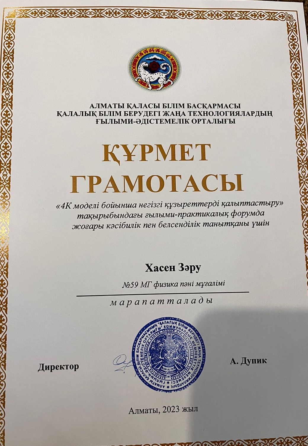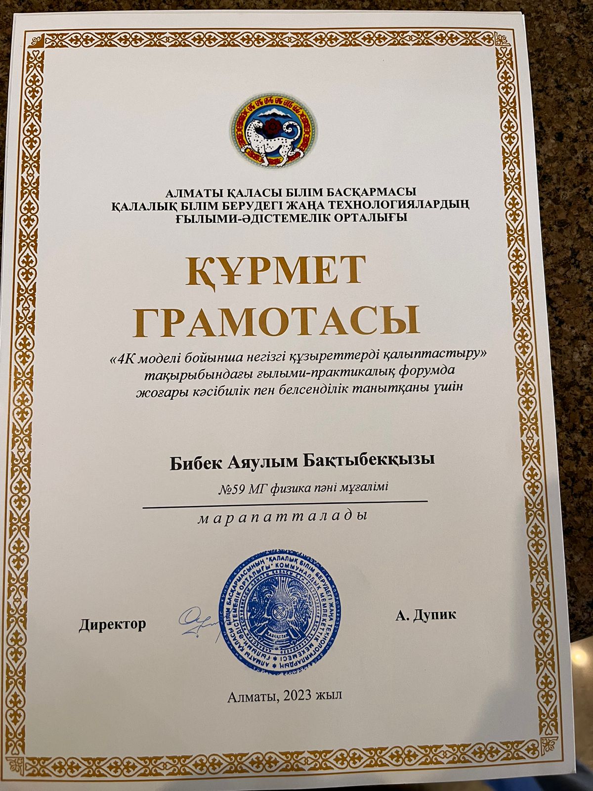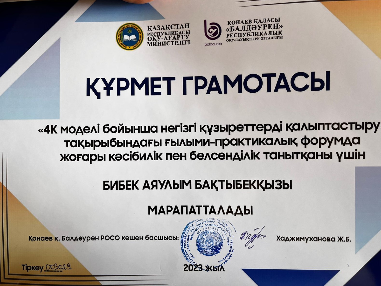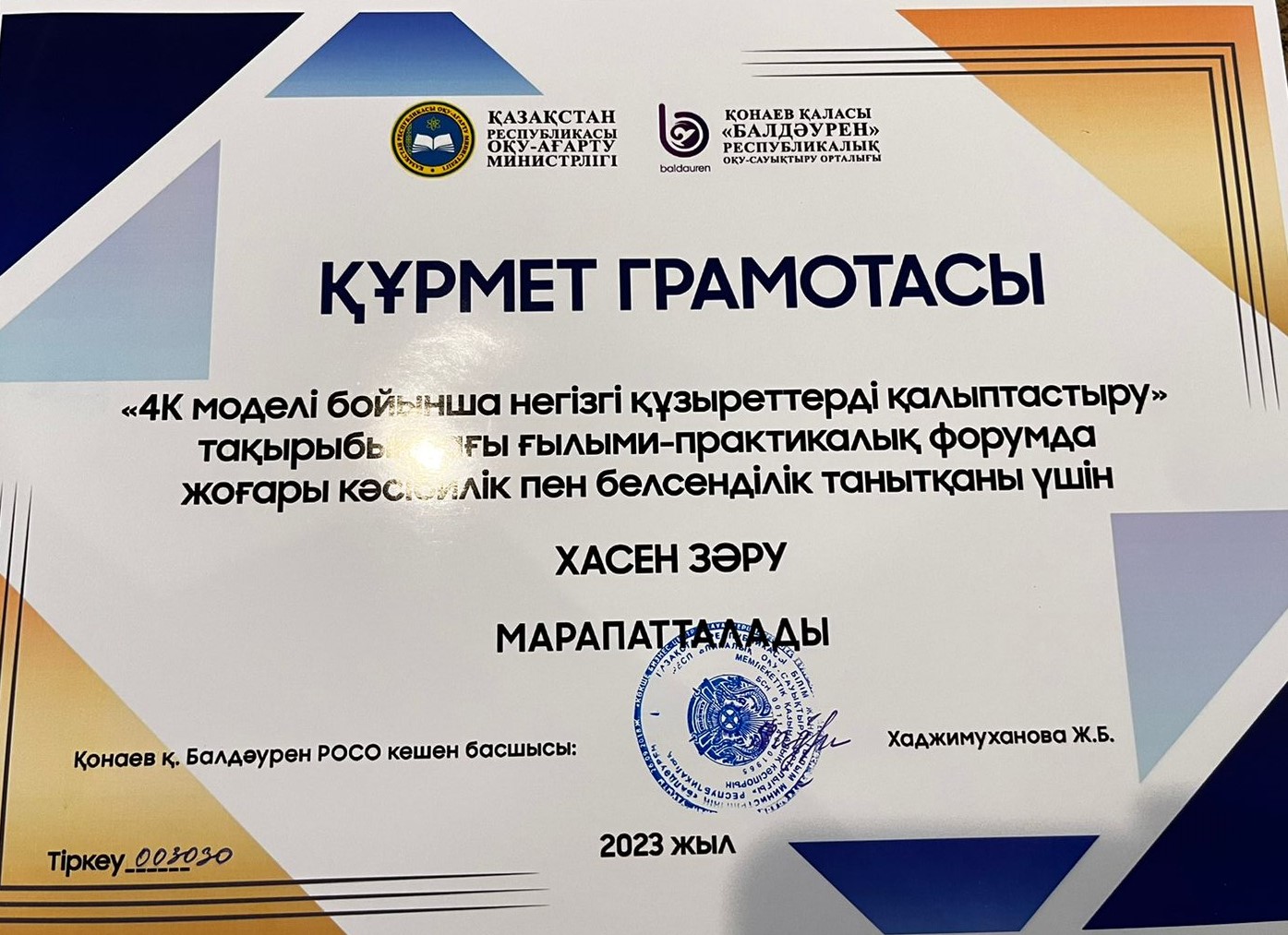 20-21 сәуір күні Балдәурен Республикалық оқу-сауықтыру орталығының базасында өткен "4К моделі бойынша негізгі құзіреттіліктерді қалыптастыру" атты қалалық ғылыми- практикалық форумда мектебіміздің физика пәні мұғалімдері Хасен Зәру мен Бибек Аяулым "Квест ойындар" шеберлік сабағын өткізіп, жоғары кәсіптік белсенділік көрсеткені үшін Балдәурен РОСО мен Қалалық білім берудегі жаңа технологиялар орталығының құрмет грамотасымен марапатталды. Құтты болсан дейміз. Біздің әріптестеріміз қала мұғалімдеріне шеберлік сабақтарын өткізіп, тәжірибелерімен бөлісуі бұл да бір игі іс. Осы ретте кәсіби маман екендіктерін көрсете білген әріптестерімізге осы бағыттағы жұмыстарына сәттіліктер тілейміз.