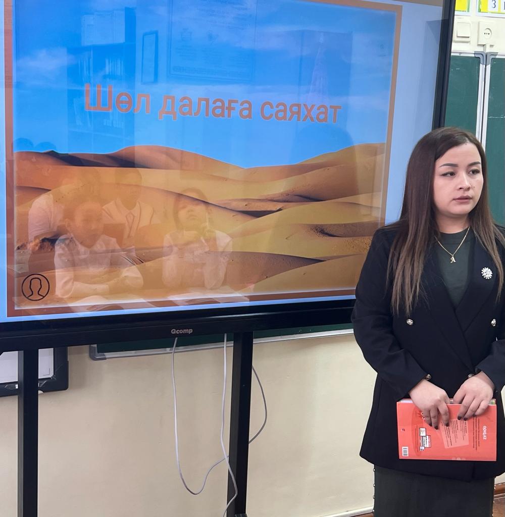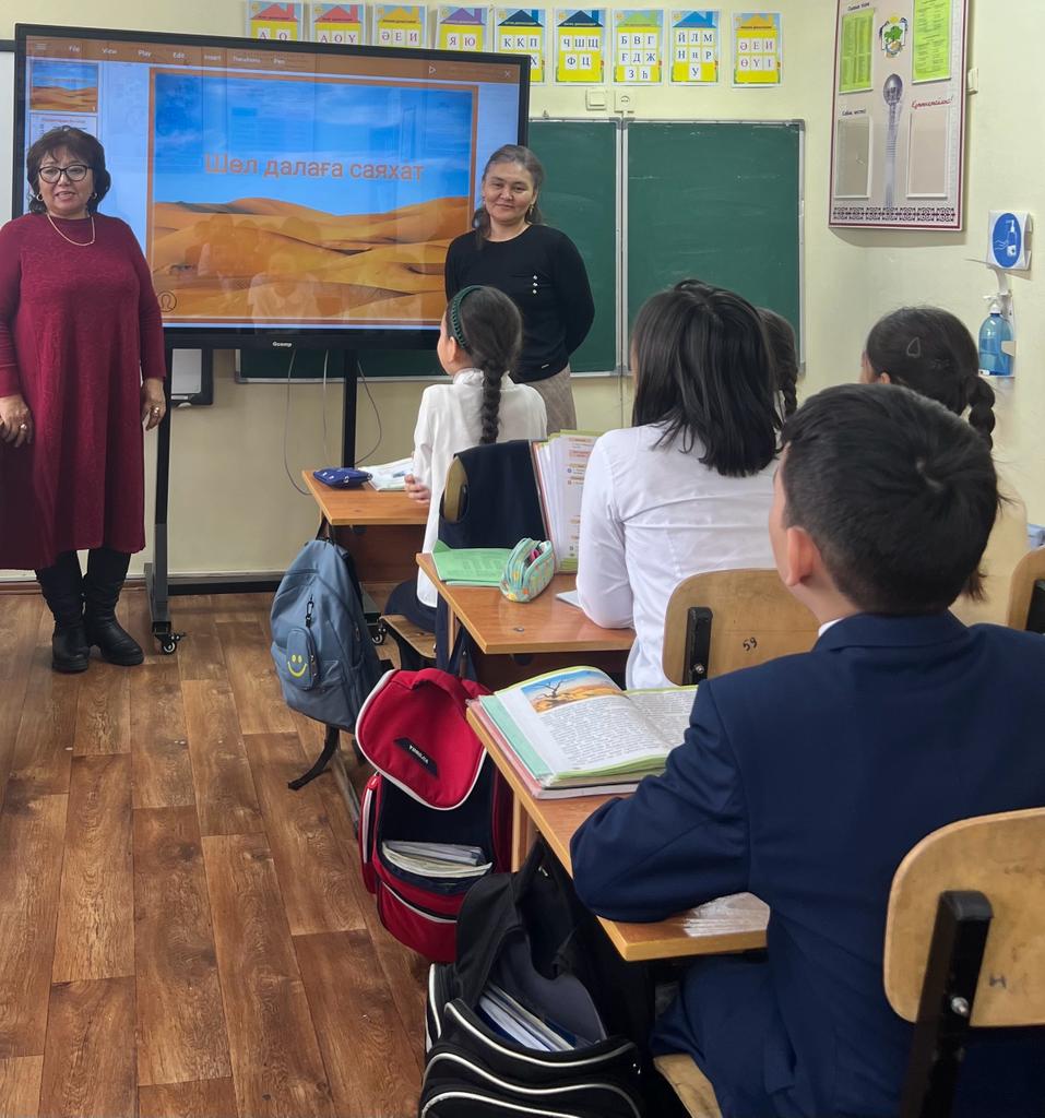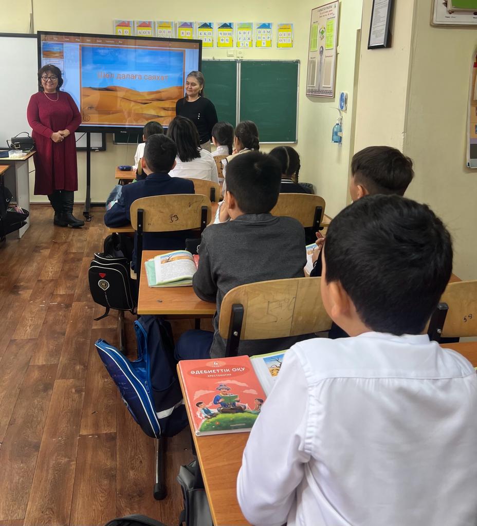 «Оқуға құштар мектеп» жобасы аясында, мектеп кітапханашылары Назира Әжібайқызы мен Гүлдана Қылышбайқызы ,4 “б”сынып оқушыларына әдебиеттік оқу пәнін негізге ала отырып «Шөл далаға саяхат» атты тақырыпта танымдық сабақ өткізді .