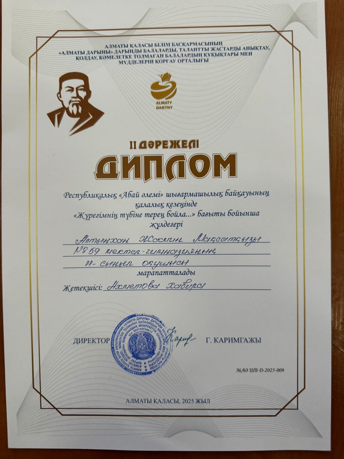 “Абай әлемі” байқауының қалалық кезеңінің 2-орын иегері