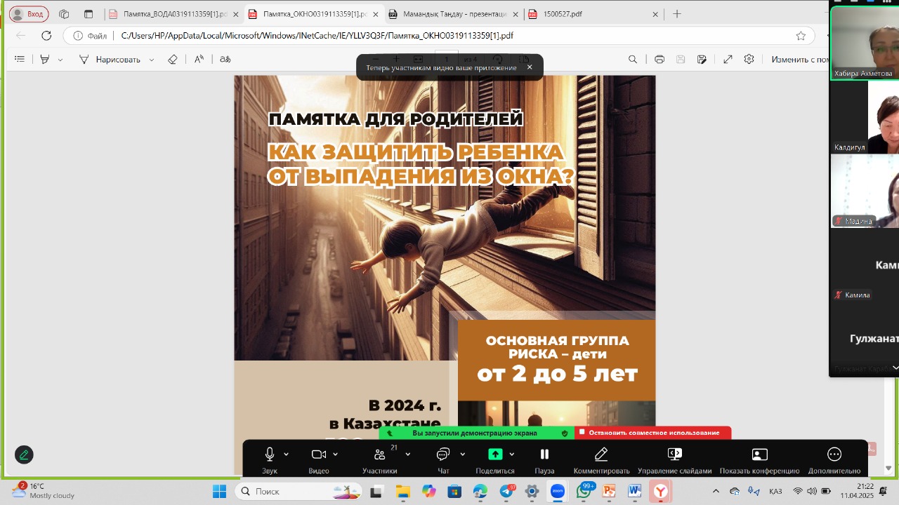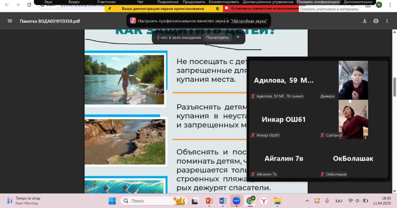 2025 жылдың 11 сәуірінде балалардың қауіпсіздігін қамтамасыз ету мақсатында, су айдындарындағы және терезеден құлаудың алдын алу т.б. қауіпсіздік шараларын сақтау үшін сыныптарда ата-аналар жиналысы өткізіліп, түсіндірме жұмыстары жүргізілді. Жиналыстар онлайн және оффлайн форматта өткізілді.