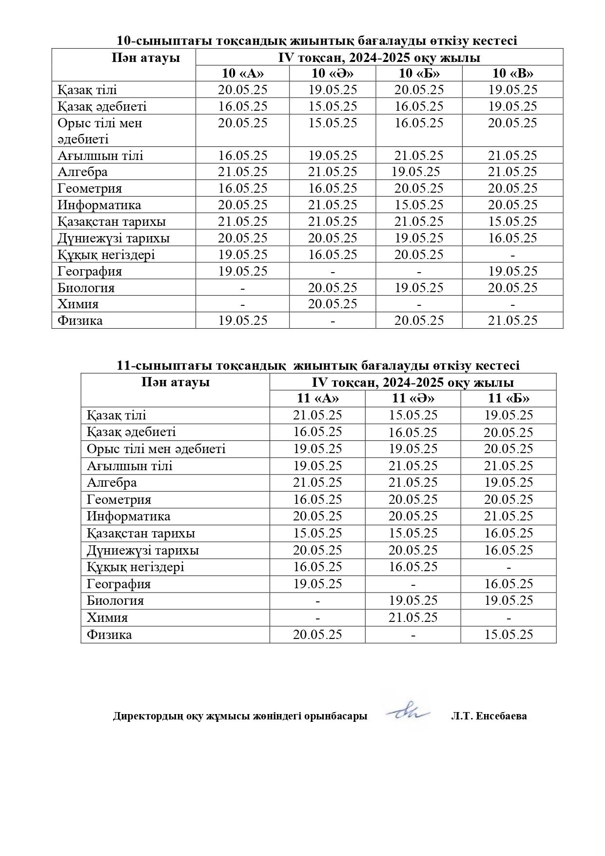 2024-2025 оқу жылының 4-тоқсанында жиынтық бағалауы бар пәндер бойынша 2-11-сыныптарға арналған ТЖБ (тоқсандық жиынтық бағалау) өткізу кестесі.