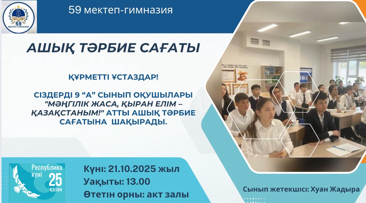 Республика күніне орай 9 “А” сынып оқушылары 2025 жылдың 21 қазан айында «Мәңгілік жаса, қыран елім – Қазақстаным!» атты ашық тәрбие сағатын өткізді.