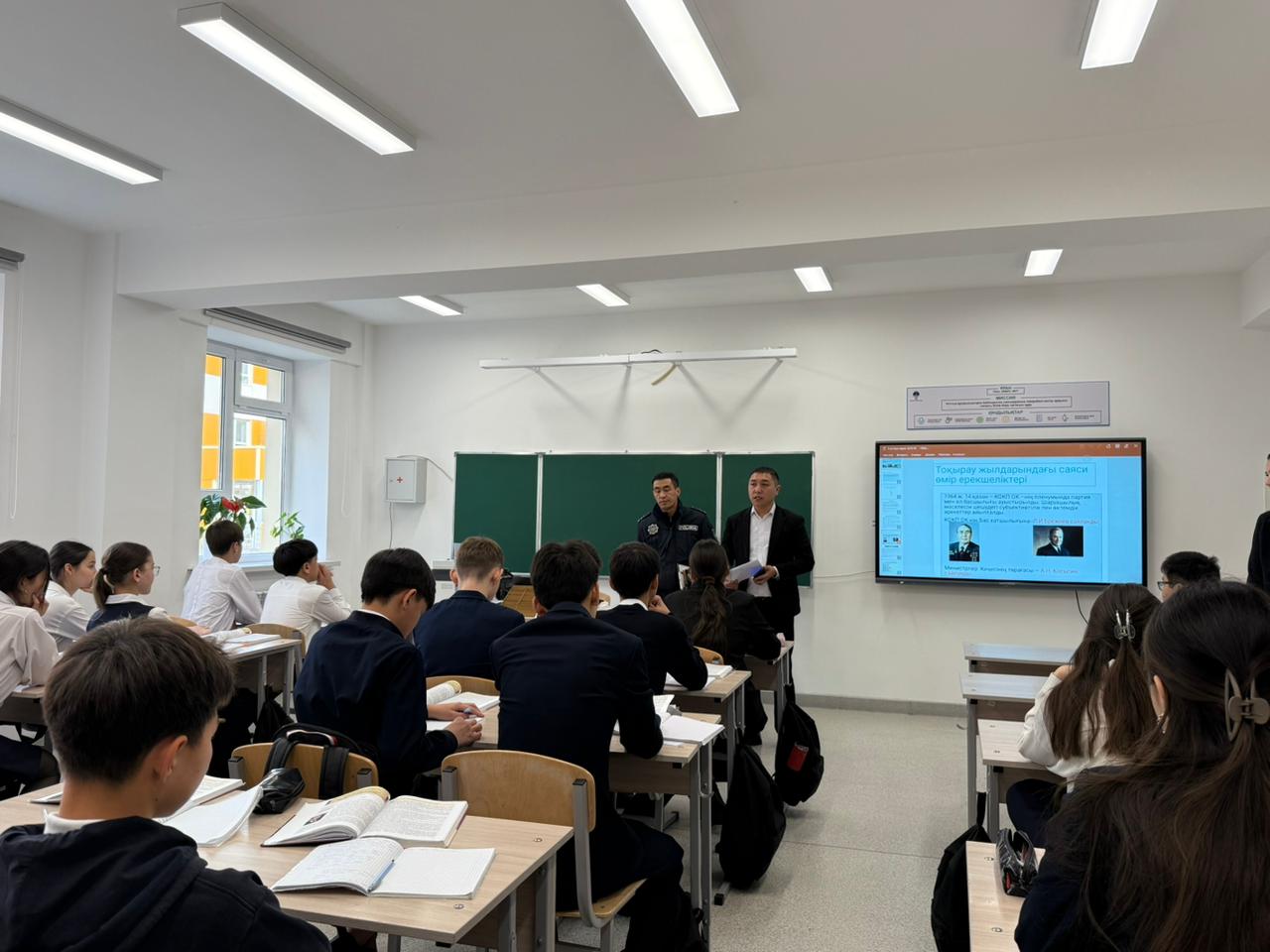 Алматы қаласы Түрксіб ауданы Полиция Басқармасының ЖПҚБ ЮПБ-ның полиция аға лейтенанты Жуманов Е.Н. және полиция майоры Исимжанов Н. және директордың тәрбие ісі жөніндегі орынбасары Устенов Саламат Жолановичпен бірге 10-сынып оқушылар арасында «ғимараттардың кіре берістердің, іргелес аумақтардың, бейнебақылау жүйелерінің,құлақтандыру құралдарының және күдікті заттар мен адамдар анықталған жағдайда персоналдың іс-қимылының терроризмге қарсы қорғалуы, сондай-ақ оқушылармен жеке және қоғамдық қауіпсіздік үшін жауапкершілік» тақырыптарында түсіндірме жұмыстары жүргізілді. Барлық оқушылар берілген тақырыппен толық танысты.
