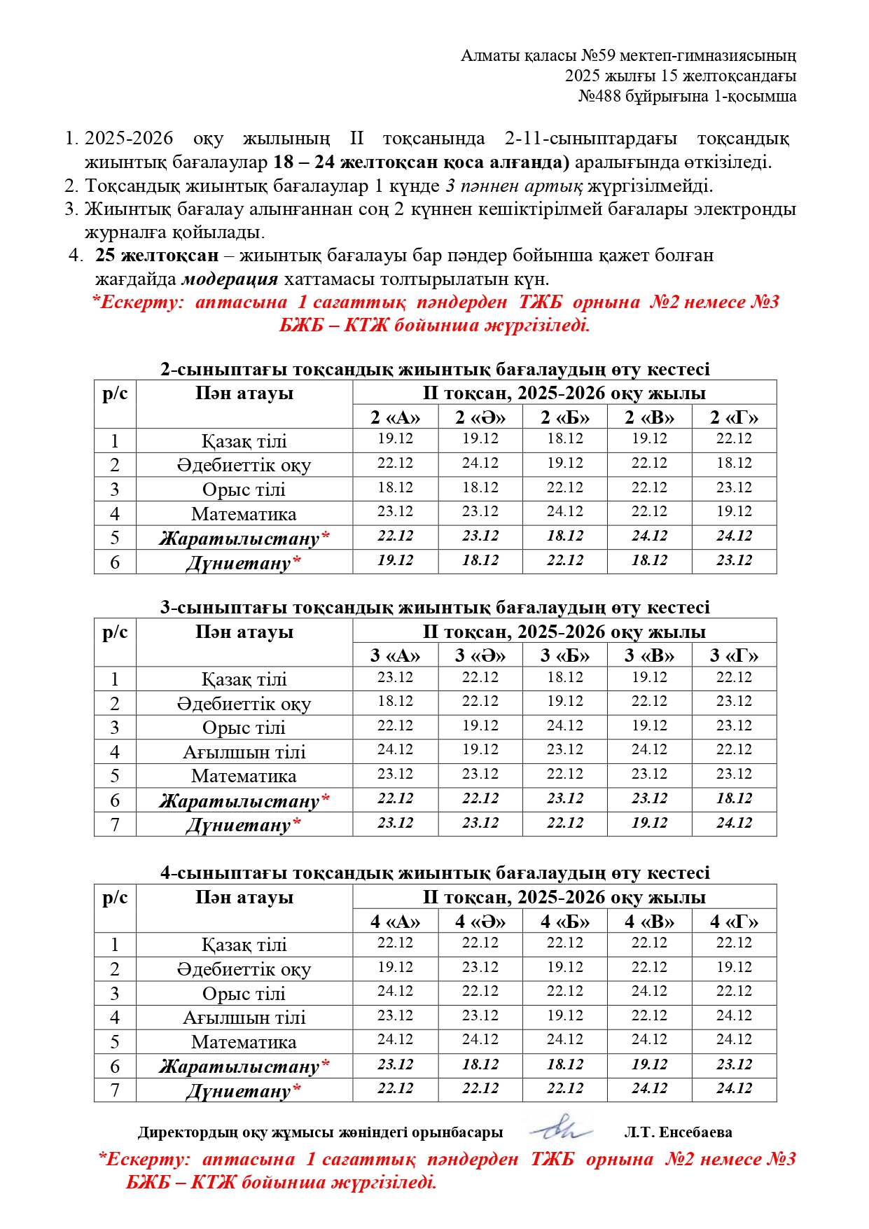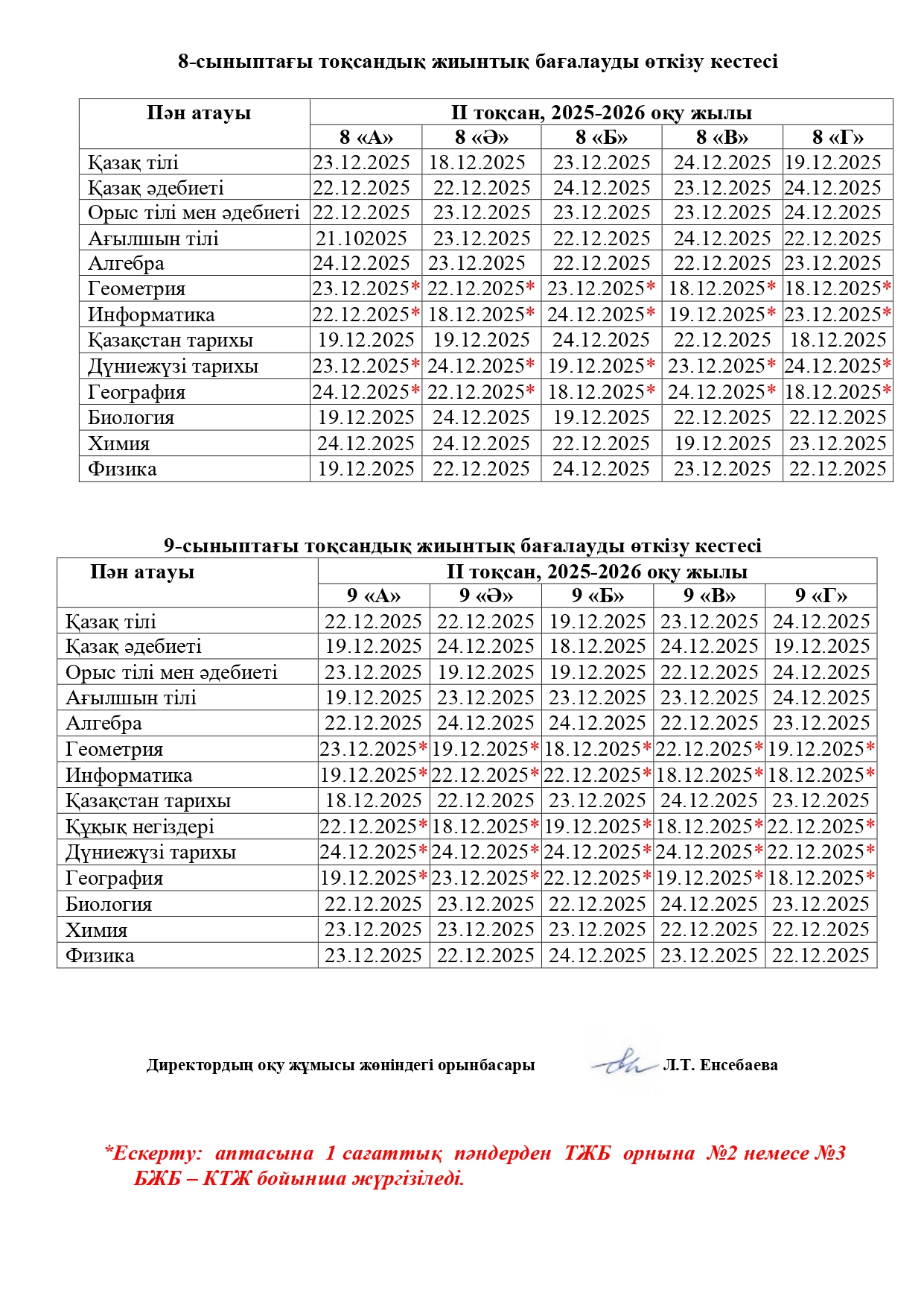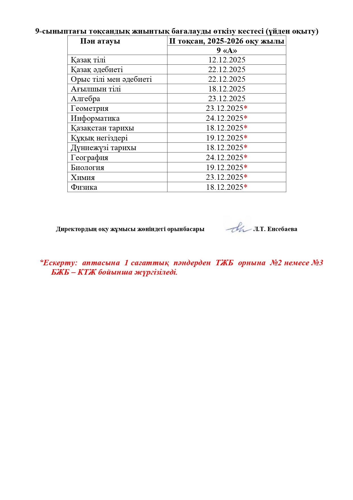 Тоқсандық жиынтық бағалау 18-24.12.2025 аралығында (қоса алғанда) өткізіледі. Кестені электронды журналдан да көре аласыздар.