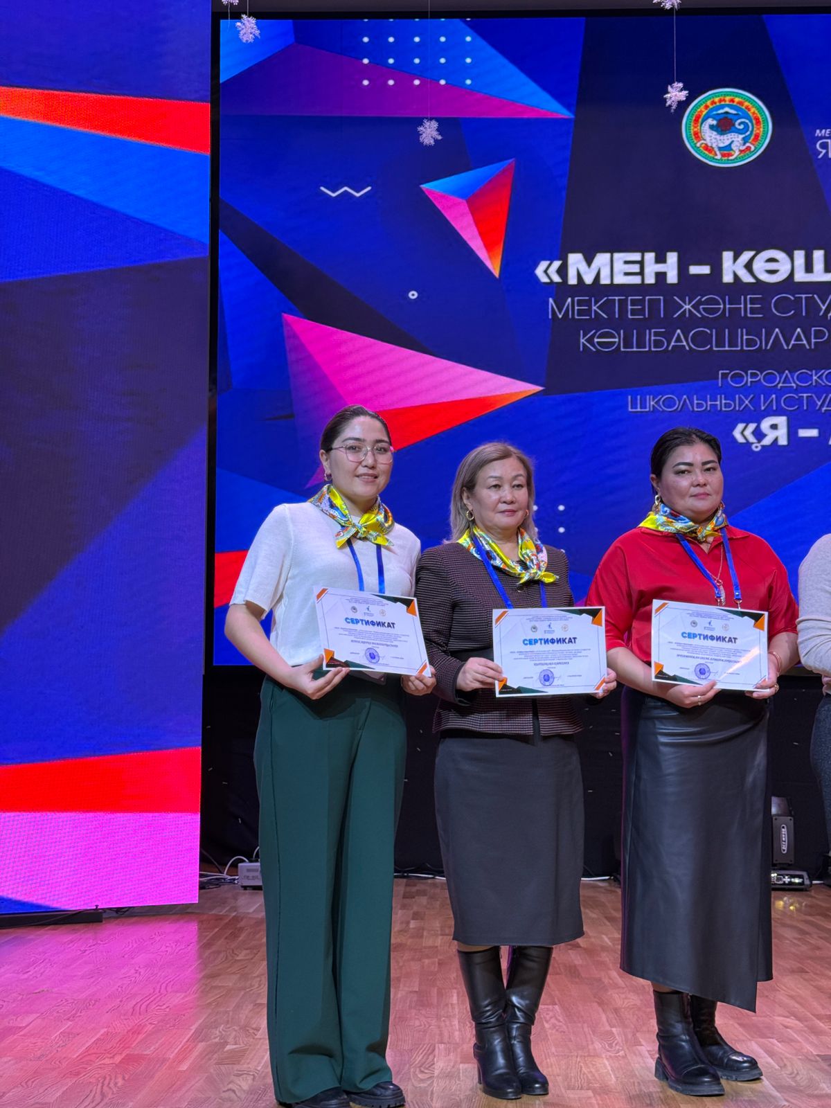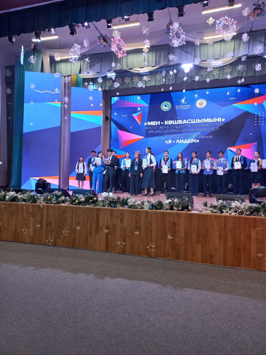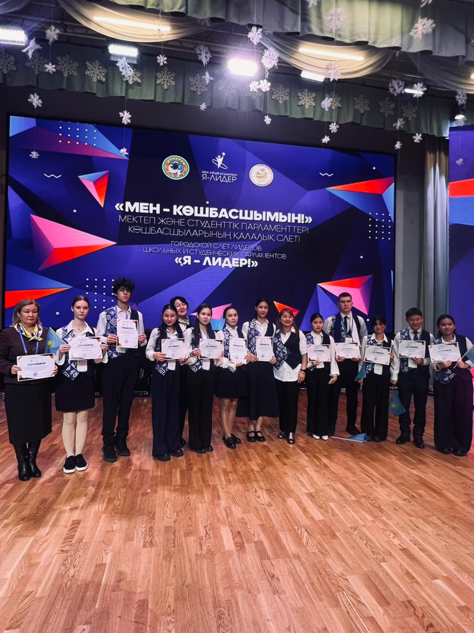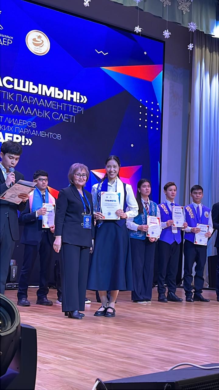 Алматы қаласы Білім басқармасының "Алматы дарыны" орталығы ұйымдастырған "Мен- көшбасшымын!" мектеп және студенттік парламенттері көшбасшыларының қалалық слеті өткізілді. Слетке мектеп парламентінің президенті 11 "Б" сынып оқушысы Жеңісқали Жадыра қатысып, "Адал азамат"" бағдарламасының Жасампаздық және жаңашылдық" құндылығы бойынша дөңгелек үстел отырысында мазмұнды баяндама жасап, жоғарғы дәрежеде көрсеткені үшін және жетекшісі ДТІЖО Кыпшакова Дариха ГРАМОТАМЕН марапатталды. Кыпшакова Д. дөңгелек үстел отырысында белсенділік танытып,модератор болғаны үшін СЕРТИФИКАТ берілді.