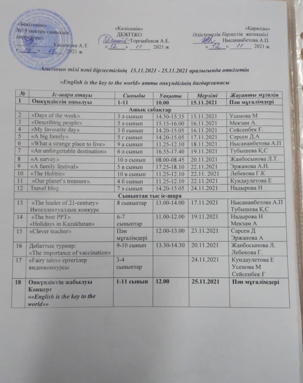 Сәлеметсіздер ме! Сіздерді 15.11-25.11 аралығында болатын ағылшын тілі бірлестігінің " English is the key to the world" тақырыбындағы онкүндігіміздің қадірлі қонағы болуға шақырамыз.