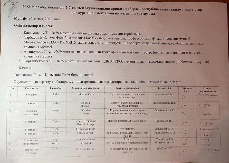 Бүгін мектебімізде 2-7 сынып оқушыларының республикалық «Зерде» ғылыми жобалар мен шығармашылық жұмыстары байқауының мектепішілік кезеңі өтті. Балалардың зерттеу қызметінің дағдыларын дамыту мен кіші және орта жастағы мектеп оқушыларының интеллектуалдық-шығармашылық әлеуетін ынталандыруды мақсат еткен аталмыш байқауға әр сыныптан 20 оқушы қатысып, ғылыми жұмыстарын ортаға салды. Әділқазылар алқасы: №59 мектеп-гимназия директоры Касымова А.Т. (комиссия төрайымы), әл-Фараби атындағы Қазақ ұлттық университетінің профессор міндетін атқарушы, филология ғылымдарының кандидаты Сарбасов Б.С. мен Қазақ ҰҚПУ – химия ғылымдарының кандидаты, химия кафедрасы бағдарлама көшбасшысы Мырзахметова Н.О., №59 мектеп-гимназияның география пәні мұғалімі, география ғылымдарының магистрі Арзикулова Г.А., №59 мектеп-гимназиясының ДБЖҒІЖО, гуманитарлық ғылымдар магистрі Торғанбеков А.Е. аталмыш байқауға төрелік етіп, бірнеше белгілері бойынша (шығармашылық, ғылыми ойлау, тақырыптың ашылуы, қолданылатын әдістердің тиімділігі...) бағалап отырды. Байқау нәтижесі бойынша Ахметова Хабира Берікболқызының 7 «Г» сыныбында оқитын шәкірттері Мырзакасимов Әділет пен Иманбекова Ақеркенің «Қазақ фольклорындағы жалмауыз кемпір бейнесі» тақырыбында жазылған командалық жұмысы 1-орынды жеңіп, үздік атанды. Қалған ғылыми жобаға қатысушылар 2, 3 орынға және «Жас ізденуші» номинациясына ие болды. Үздік жұмыстар келесі кезеңге жолдама алды.