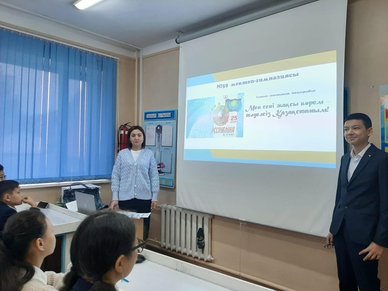 18.10.2022 жылы Түрксіб ауданы №59 мектеп-гимназиясында 25 қазан Республика күніне орай 1-11 сыныптар арасында "Мен сені жақсы көрем- тәуелсіз Қазақстаным" тақырыбында біріңғай сынып сағаттары өткізілді. Жауапты: Директордың тәрбие ісі жөніндегі орынбасарлары: Кыпшакова Д., Әлімжан Д.М.