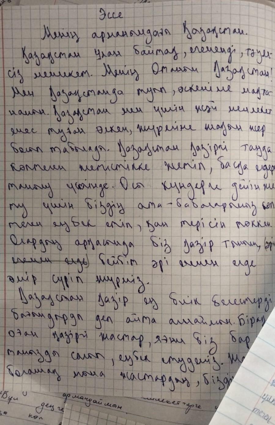 Бүгін мектеп оқушылары, «Жас Ұлан» ұйымы мүшелері Республика күніне орай эссе жұмыстарын жазды. Тақырып: «Менің арманымдағы Қазақстан». Тақырып оқушылар үшін қызықты болып, туған елі мен жері туралы өз ойлары мен ішкі сезімдерін шығарма жұмысында көрсетіп, барынша мәнді де мағыналы етіп жазуға тырысты. Жалпы Отан, туған жер, Қазақстан туралы тақырыптар бойынша біздің мектебімізде түрлі іс-шаралар мен байқаулар ұйымдастырылып тұратындықтан балалар үшін бұл таңсық болмай, қайта біраз нәтижелерге қол жеткізіп, төселіп алған болатын. Сондықтан да балалар берілген тапсырманы дер кезінде орындап, білім-танымын тиісті деңгейде көрсете алды. Тәрбиелік мақсатта ұйымдастырылып отырған бұл игі іс шара балаларға Отанын қадірлеуге, ел тарихына үңіліп, туған еліне деген сүйіспеншілік сезімін қалыптастыруға мол септігін тигізеді. Мектеп оқушыларына эссе жұмыстарын орындатып, шығармашылық жұмыспен айналысуына ұйытқы болған – мектеп тәлімгері, қазақ тілі мен әдебиеті пәні мұғалімі Едігетегі Қанат Әбдіманапұлы.