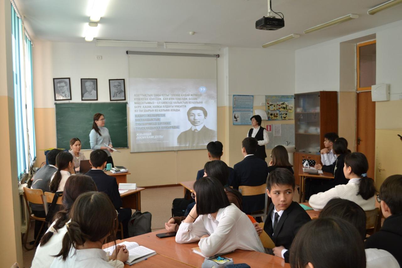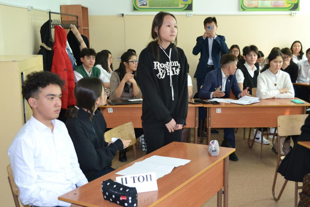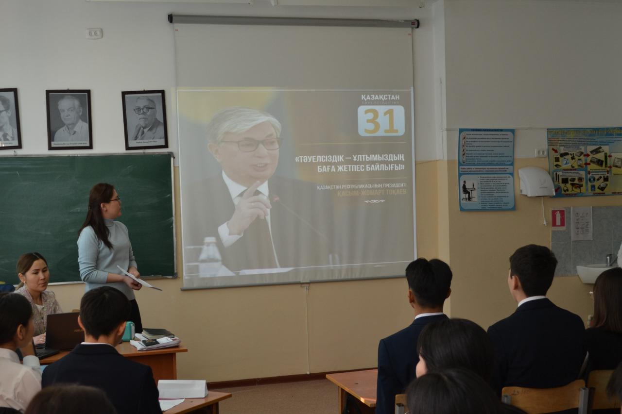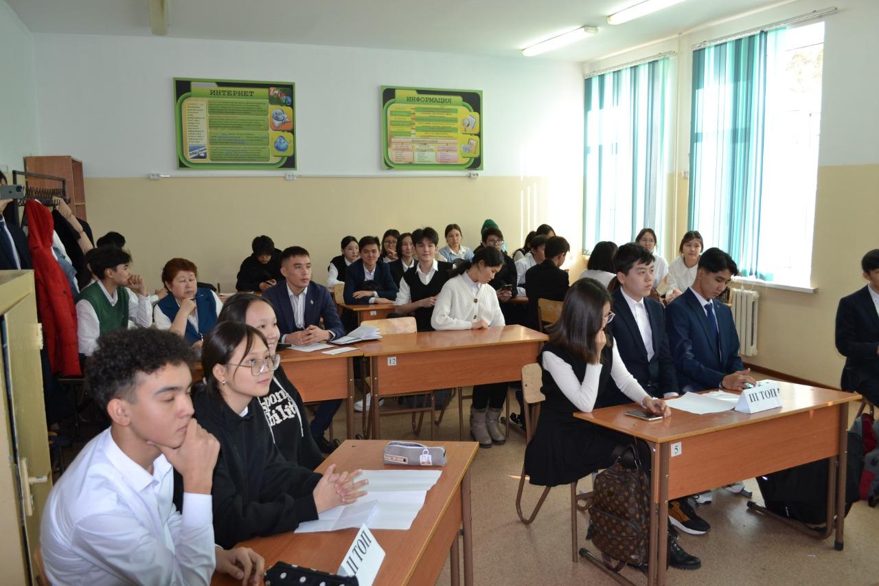 «Туған елің – Қазақстанды жақсы білесің бе?» деген тақырыпта бүгін тарихшы мұғалімдердің ұйытқы болуымен 9-сынып оқушылары арасында интеллектуалдық сайыс ұйымдастырылды. Отанға деген сүйіспеншілік, туған жер, атамекенге құрмет сезімін қалыптастыру мақсатында ұйымдастырылып отырған сайыс 3 топ арасында («Алаш» 9 «А» сыныбы, «Қыран» 9 «Б» сыныбы, «Тәуелсіздік» 9 «В»сыныбы) өтіп, қызу тартысқа толы болды. Жүргізуші-тарих пәнінің мұғалімі Тұрсынбай Гүлзат Ерланқызы алдымен интеллектуалдық сайыстың тақырыбы мен мақсатын айтып, сайыстың талаптары мен әділқазы мүшелерімен таныстырып, тақырыпқа орай бейнефильм көрсетті. 5 кезең бойынша өткізілген сайыста оқушылар белсенді болып, өз білімдерімен озуға тырысып бақты. Сайыстың төртінші кезеңіндегі сөзжұмбақтың жауабын 3 тілде айтып беруі де сайыстың мәнді тұсы болды. Нәтижесінде әділқазылар шешімімен «Қыран» тобы І орынға, «Тәуелсіздік» тобы ІІ орынға, «Алаш» тобы ІІІ орындарға ие болып, мақтау қағаздарымен марапатталды. Қатысқан оқушыларға «Қазақстан» шоколадтарын беріп, ризашылық сезімдерін айтып, Тәуелсіз еліміздің болашақ азаматтары сендерсіңдер деген ізгі тілектерін білдірді.