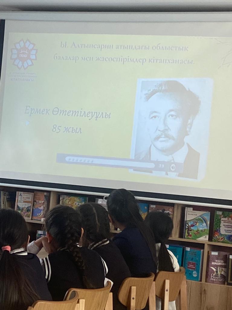 Кеше аудандық №1 кітапханада мектеп кітапханашысы Кабытаева Назира Ажибаевна мен кітапхана қызметкерлерінің ұйымдастыруымен балалар ақыны Ермек Өтетілеуұлының 85 жылдық мерейтойына арналған "Бала тілін тапқан ақын" атты тәрбие сағаты өткізілді. «Балдырған» журналы мен «Жазушы», «Жалын» баспаларында ұзақ жылдар бойы еңбек етіп, балалар үшін көптеген кітаптар шығарған ақын-жазушы Ермек Өтетілеуұлының шығармаларын оқушыларға кеңінен таныстырып, оқыту, мол мұрасын насихаттау негізінде маңызды дүниелердің бірі. Осы игі шараларды қолға алған кітапханашы апайларымыз «Оқуға құштар мектеп» жобасы аясында жүзеге асырып, балалардың кітап оқуға деген қызығушылығын көтеріп, білім-танымын артыруға еңбек етіп келеді. Аталмыш іс-шара барысында балаларға бейнефильм ұсынылып, ақынның "Ең күшті адам", "Біз өсіп келеміз", "Баластан" сияқты көптеген кітаптарымен таныстырып, сұрақтар қойылып, кішігірім әдеби кеш форматында өткізілді. Көңілді ахуалда өткен тәрбиелік шараға балалар риза болып, ақын-жазушы туралы көп дүниелерді біліп алып, ұйымдастырушы апайларына алғыстарын айтты.