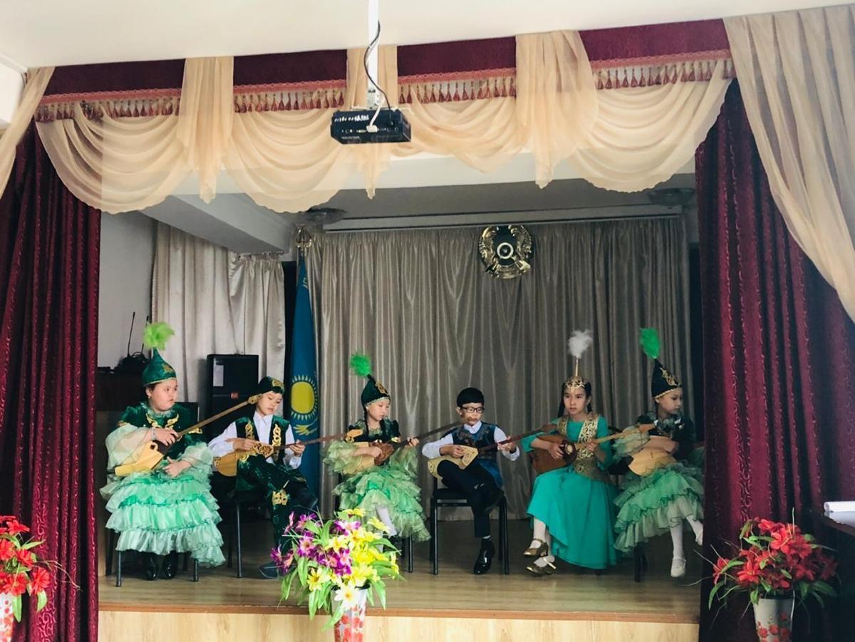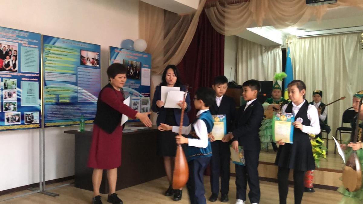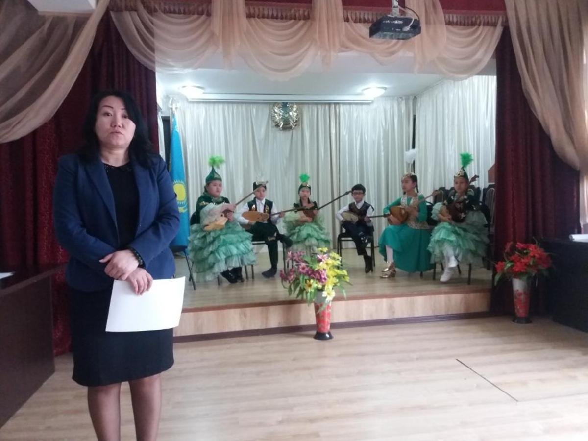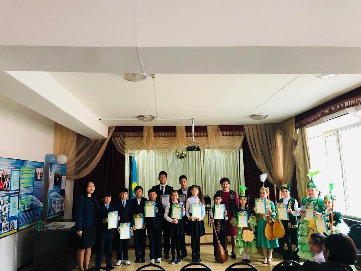 Қазақ тілі мен әдебиеті пәндері бойынша ұйымдастырылған І мектепішілік олимпиаданың ашылу салтанатынан көрініс