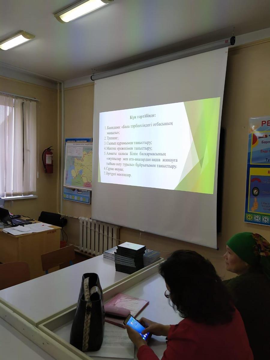№59 мектеп-гимназия бойынша сыныптарда «Бала тәрбиесіндегі отбасының маңызы» атты тақырыпта ата-аналар жиналысы өткізілді. Мақсаты: Ата - ананың отбасындағы рөлін анықтау, өз балаларының болашағы туралы пікірлерін тыңдау. Ата - ананың ме