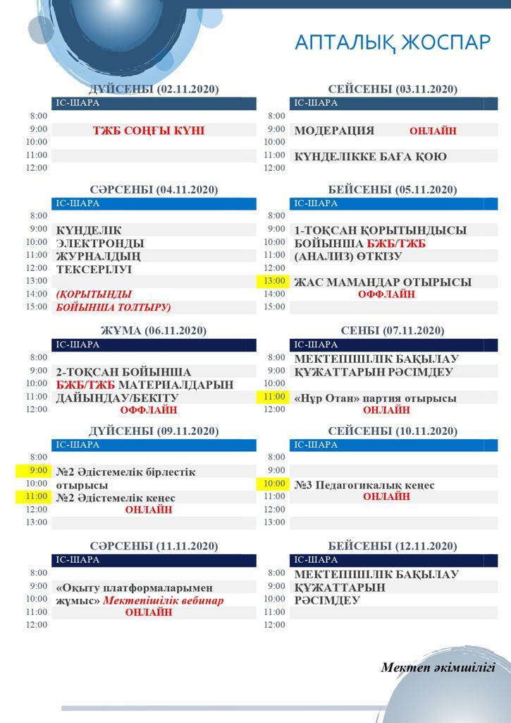 02 ноябрь 2020 0 1 2 3 4 5 №59 мектеп-гимназиясының 2020-2021 оқу жылындағы 2-12 қараша аралығындағы 1 тоқсандағы апталық жоспар.