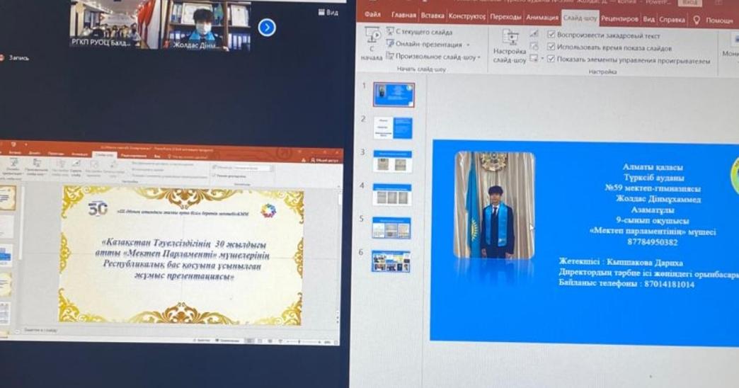 59 мектеп-гимназия » Біз туралы » Іс-шаралар » "Мектеп парламенті" өзін-өзі басқару ұйымдары мүшелерінің Республикалық онлайн басқосуында іріктеліп алған жұмыс нәтижесі қорғалды.Іріктеуден әр облыс бойынша өткен 59 мектеп-гимназиясының жұмысы үздік деп танылып іс-тәжірибесі таратылды.