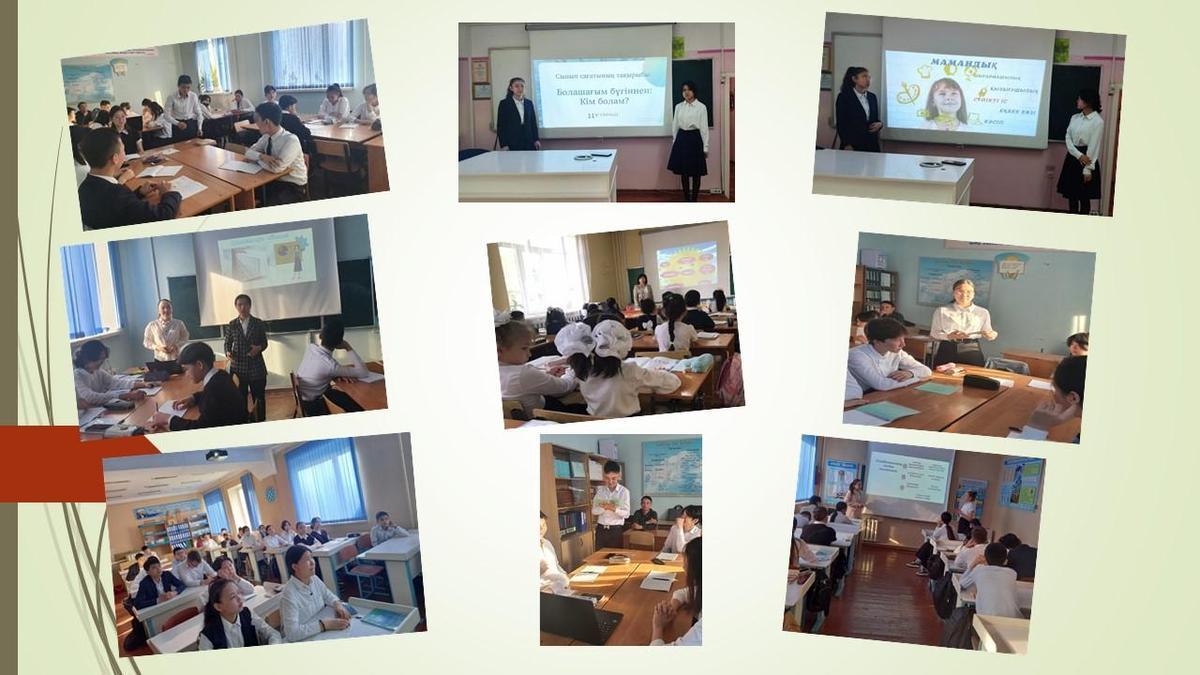 Бүгін 1-4 сыныптарда "Біз - табиғат қорғаны", 5-11 сыныптарда "Болашағым бүгіннен: Кім болам?" тақырыптарында сынып сағаттары өткізілді. 8-сыныптарда Саналы ұрпақ тәрбиесін жетілдіру тұжырымдамасы бойынша: "Көшбасшы болу өнері. Басқаларды басқару үшін алдымен өзіңді басқаруды үйрен" тақырыбында дөңгелек үстел ұйымдастырылды. Жауапты: ДТІЖО Кыпшакова Д., сынып жетекшілер.