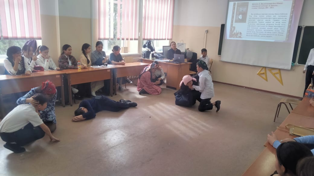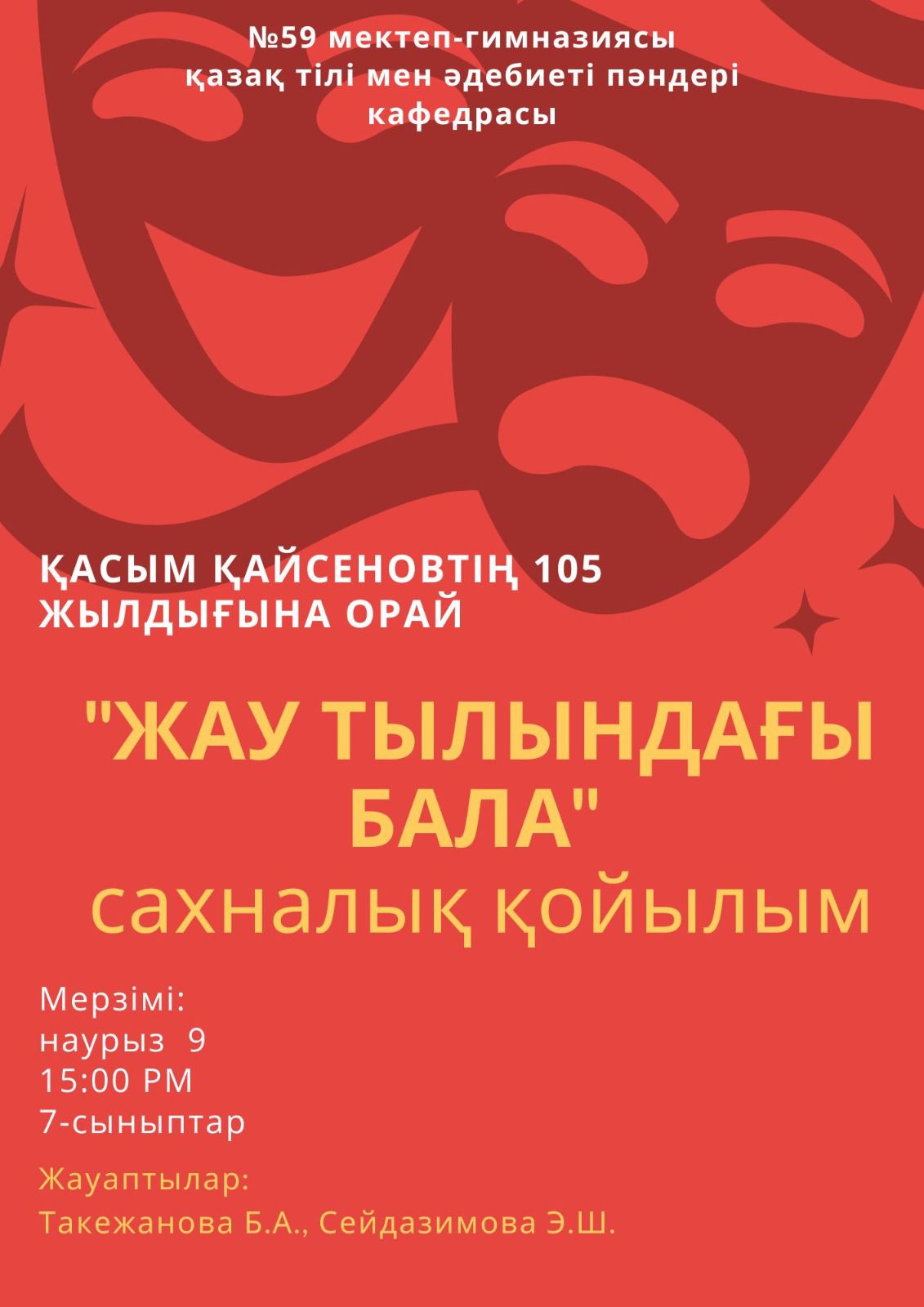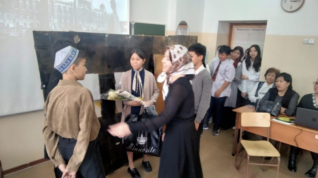 Қазақ тілі мен әдебиеті пәндері кафедрасының онкүндігі аясында бейсенбі күні аты аңызға айналған партизан, көрнекті жазушы Қасым Қайсеновтың 105 жылдығына орай іс-шара өтті. Іс-шарада «Жау тылындағы бала» шығармасының желісі бойынша 7-сынып оқушылары сахналық қойылымдар қойып, өзара сынға түсті. Өте тартысты, қызықты, оқушылардың актерлік шеберліктері мен творчестволық қабілеттері ортаға түскен байқау жалпы онкүндік аясындағы ең айтулы іс-шара ретінде ерекшеленді. Балалар өздерін қаншалықты талантты, белсенді, шығармашыл екендіктерін барынша көрсетуге тырысып бақты. Декорация, фон, қағаз-картоннан жасалған вагондар, фашистердің формасы, қарапайым тұтқындардың киімдері... тура театрландырылған көрініс берді. Тартысты өткен байқау нәтижесінде 1-орынды 7 «Б» сынып оқушылары жеңіп алса, 2-орынды 7 «В» сынып оқушылары, ал 3-орынға 7 «Г» сынып оқушылары жайғасты. Жоғары деңгейде ұйымдастырылған іс-шара барша көрермендердің көңілінен шығып, естен кетпестей әсер қалдырды. Осы ретте оқушыларға қолдау беріп, сахналық қойылым қоюға көмектескен жетекшілеріне, мұғалімдеріне ризашылық сезімдерімізді білдіре кетсек дейміз. Ал аталмыш іс-шараға жауапты болған қазақ тілі мен әдебиеті пәні мұғалімдері Сейдазимова Элеонора Шариполлақызы мен Такежанова Бақыт Ахатқызына алғыс айтамыз.
