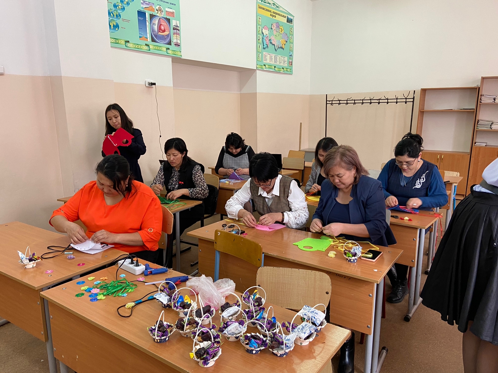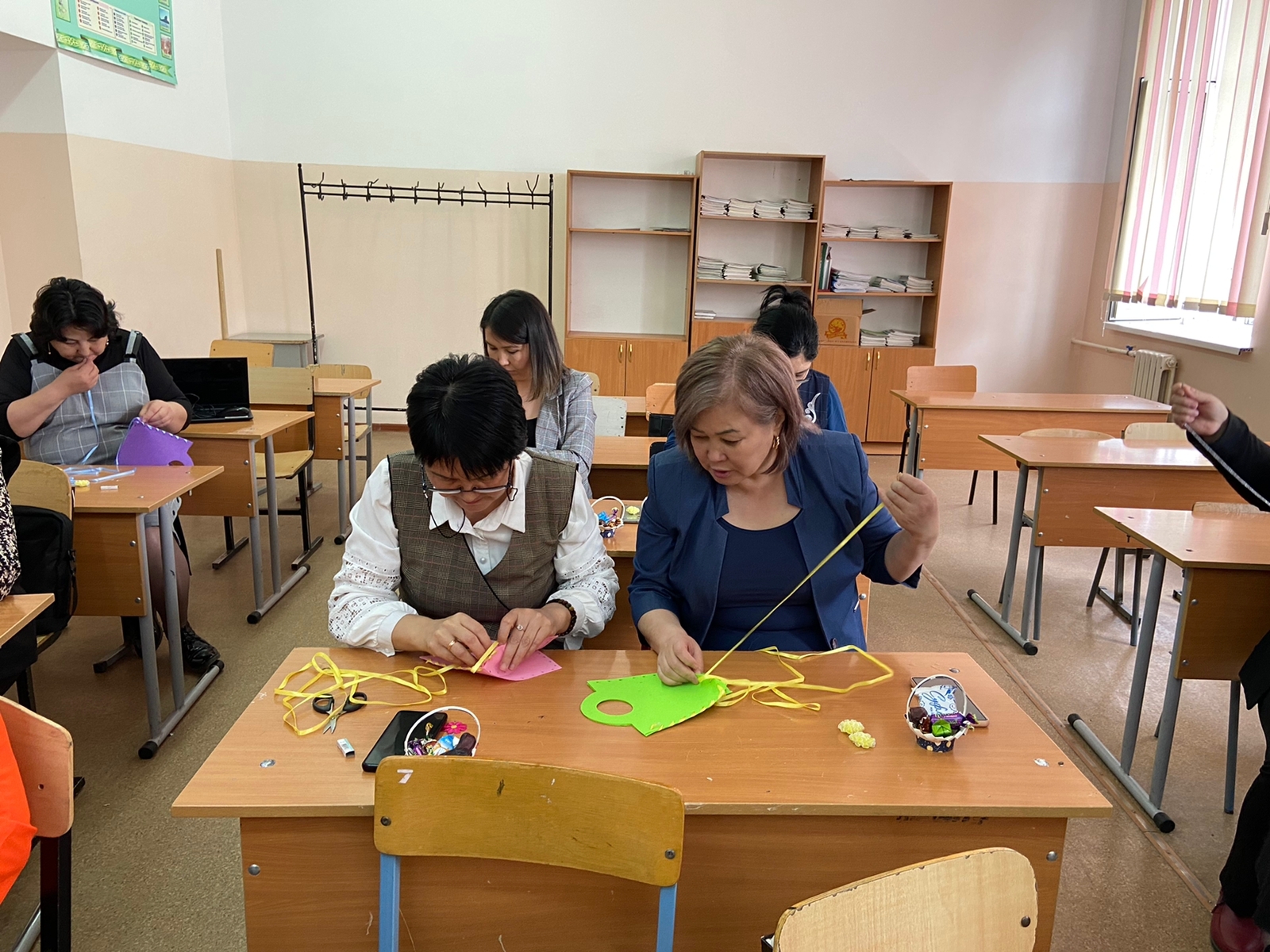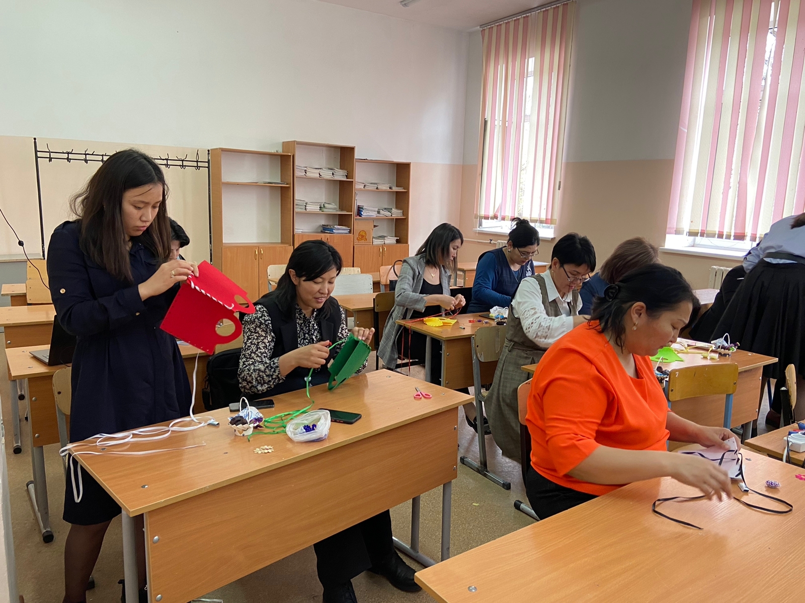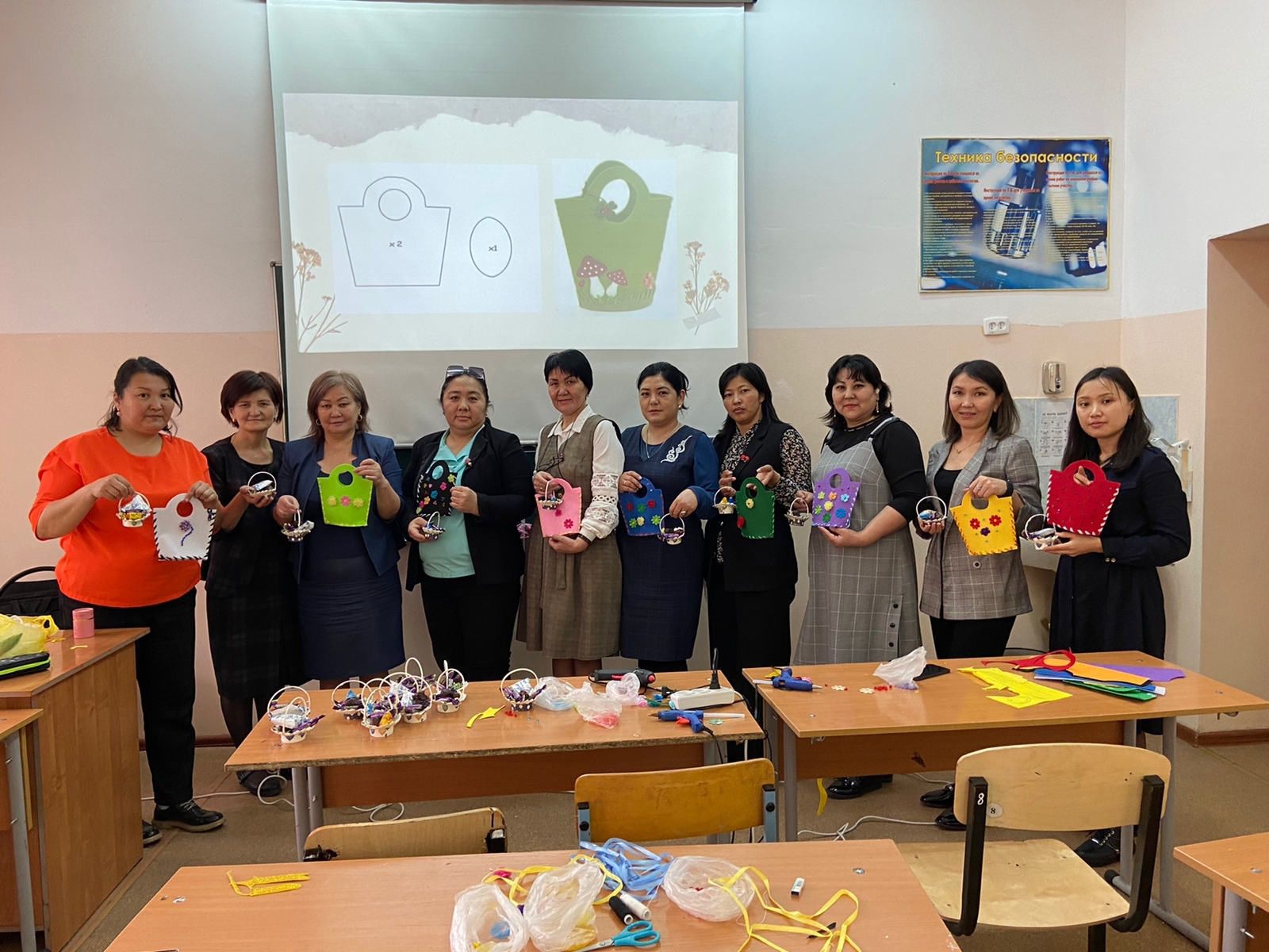 Бүгін Эстетикалық пәндер бірлестігінің онкүндігі аясында «Фетрмен жұмыс жасау» тақырыбында шеберлік сабақ өтті. Ұйымдастырушы апайлар, «Көркем еңбек» пәнінің мұғалімдері Бижанова Гүлжан мен Сауат Айман шеберлік сабағында мұғалімдерге фетрмен жұмыс жасаудың әдіс-тәсілдерін үйретіп, қалай әдемі, тез және күнделікті қажетті болатын заттарды жасаудың жолдарын көрсетті. Сабаққа қатысқан мұғалімдер бір кісідей атсалысып, тігін өнеріндегі қабілеттерін ортаға салып, әдемі, шағын бұйымды жасап шығаруға тырысып бақты. Нәтижесінде барлық қатысушылар фетрді пайдалана отырып, безендірілген әдемі сөмкені жасап шығарды. Онкүндік аясында ұйымдастырылған аталмыш сабақ сәтті өтіп, қатысушы мұғалімдер дән-риза болып жатты.