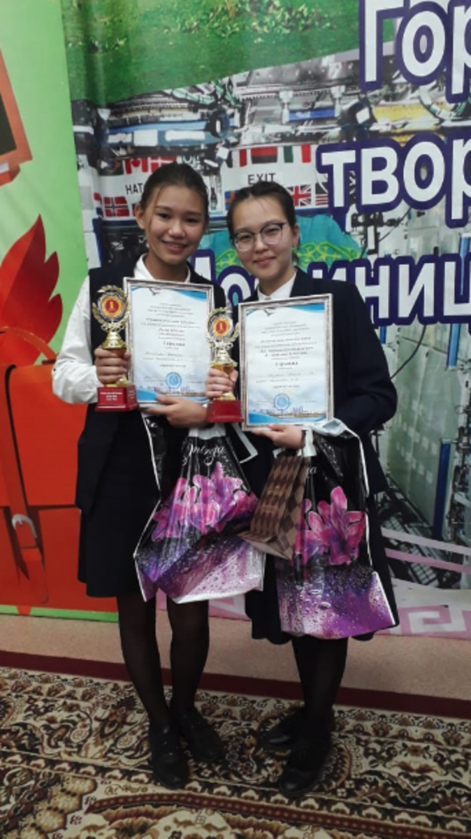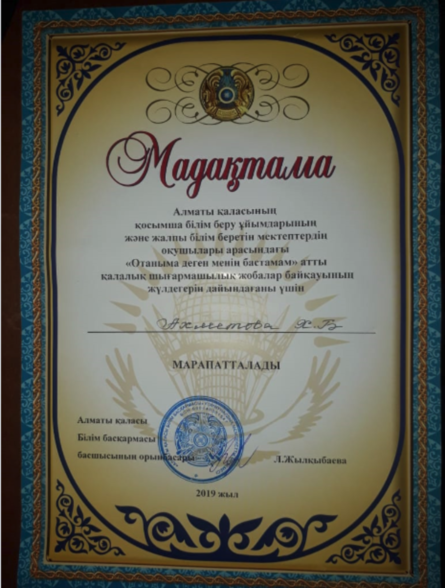 "Отаныма деген менің бастамам" атты қалалық шығармалар байқауынан Мұқаш Анель "Мен-Қазақстан азаматымын"! номинациясы бойынша 1-орынды жеңіп алды.Жетекшісі Ахметова Х.Б. грамотамен марапатталды.