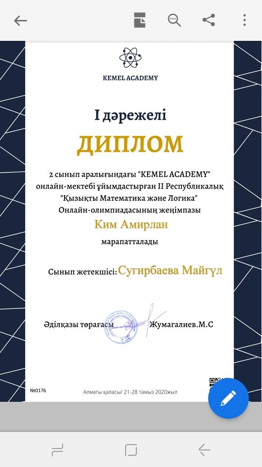 59 мектеп-гимназия » Біз туралы » Жетістіктеріміз » № 59 мектеп- гимназия оқушысы Ким Амирлан 2 сынып аралығындағы «KEMEL ACADEMY» онлайн- мектебі ұйымдастырған ІІ Республикалық «Қызықты Математика және Логика» Онлайн Олимпиадасының І дәрежелі жеңімпазы атанды.