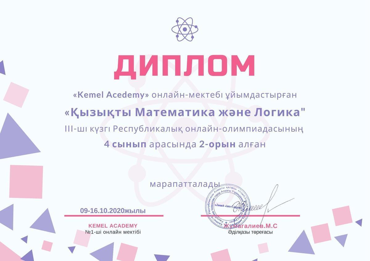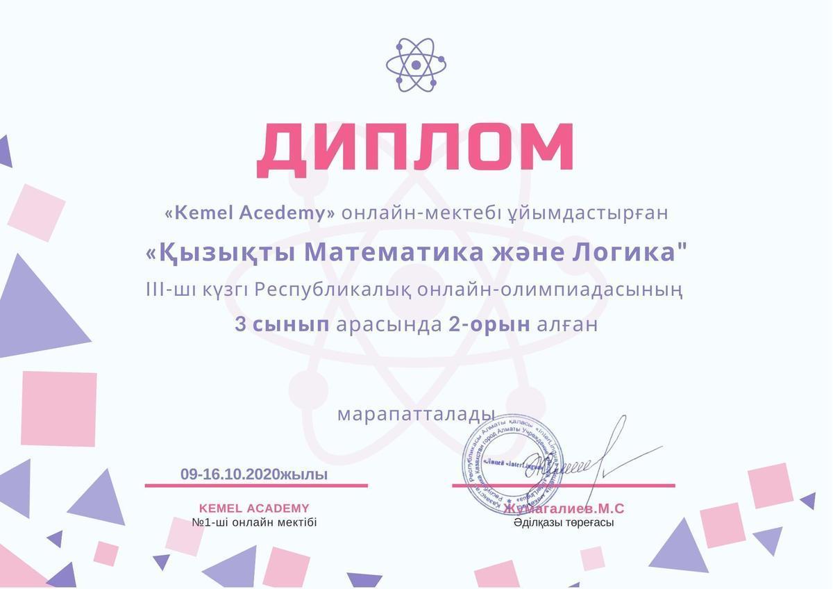 «Kemel Acedemy» онлайн мектебі ұйымдастырған «Қызықты Математика және Логика» ІІІ-ші күзгі Республикалық онлайн олимпиадасы Жиенбаев Бейбарыс Ернарұлы, 3 сынып арасында 2 орын алғаны үшін Жиенбаева Назерке Ернарқызы марапатталды.