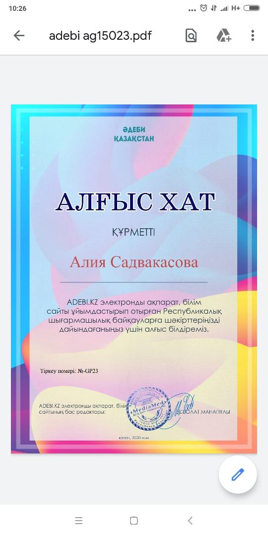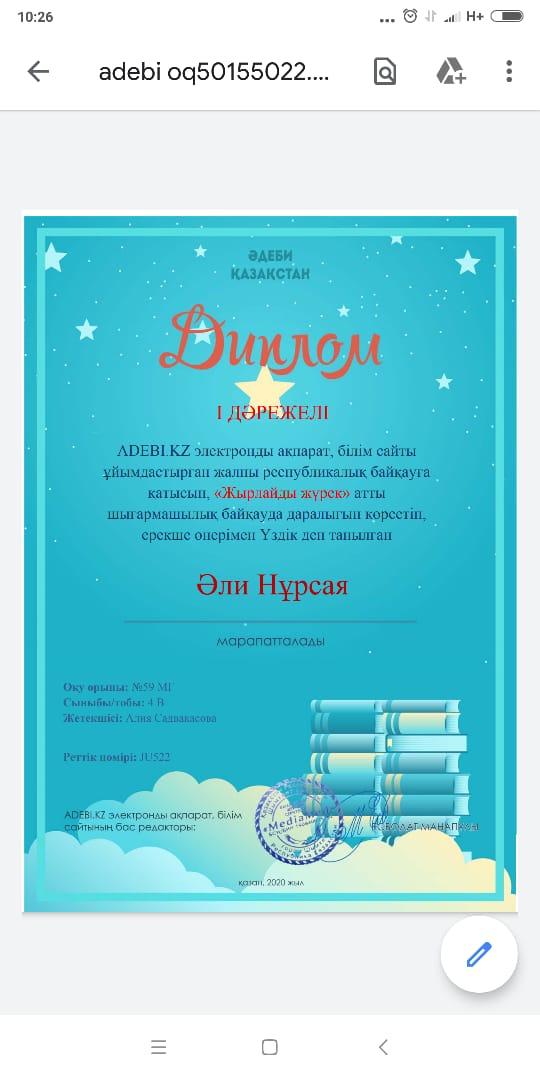 №59 мектеп-гимназия «ADEBI KZ» электронды ақпарат білім сайты ұйымдастырған жалпы республикалық байқауға қатысып «Сиқырлы бояулар» , «Кітабым - серігім» , «Жырлайды жүрек» атты шығармашылық байқауларда даралығын көрсетіп, ерекше өнерімен Үздік деп танылған Әли Нұрсая І дәрежелі дипломмен марапатталды.Және жетекшісі Алия Садвакасова да шәкірт дайындағаны үшін алғыс хатпен марапатталды.