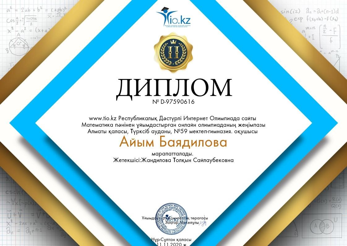 www.tio.kz Республикалық Дәстүрлі Интернет Олимпиада сайты Сауат ашу пәнінен ұйымдастырған онлайн олимпиаданың жеңімпазы Алматы қаласы, Түрксіб ауданы, №59 мектеп-гимназия оқушысы Айым Баядилова марапатталады. Жетекшісі Жандилова Толқын Сайлаубековна.