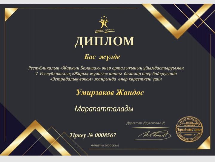№59 мектеп-гимназия оқушылары Умирзаков Жандос пен Капсаламатова Айгерім Республикалық «Жарқын Болашақ» өнер орталығының ұйымдастыруымен V Республикалық «Жарқын Жұлдыз» атты балалар өнер байқауында «Эстрадалық вокал» жанрында бас жүлдені иеленді. Жетекшісі: Кыпшакова Дариха.