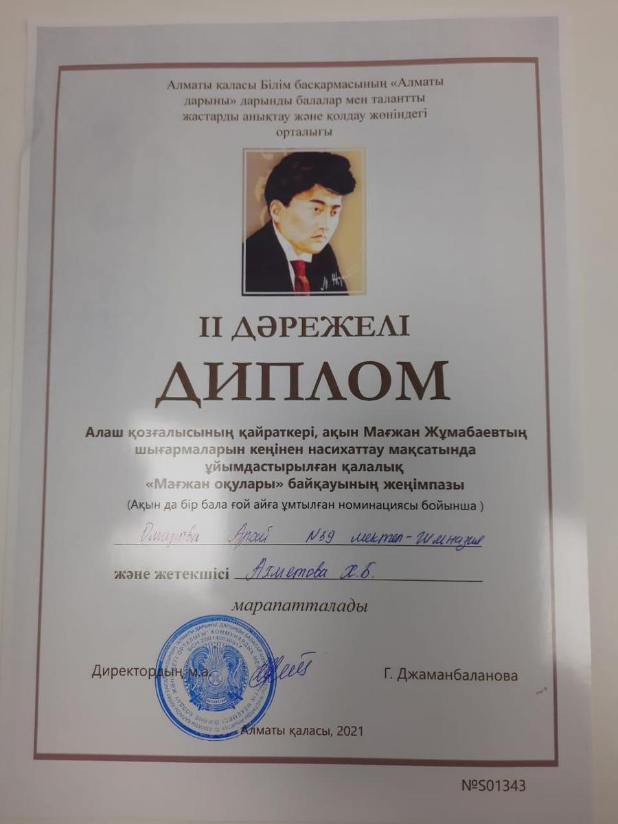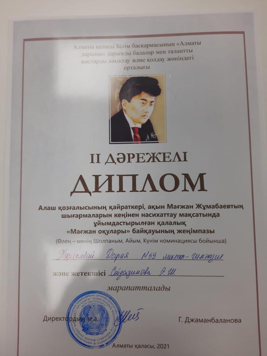 Алаш қозғалысының қайраткері, ақын Мағжан Жұмабаевтің шығармаларын кеңінен насихаттау мақсатында ұйымдастырылған қалалық "Мағжан оқулары" байқауының жеңімпаздары: Тұрсынбай Дария, Омарова Арай. Жетекшілері: Сейдазимова Эленора, Ахметова Хабира.