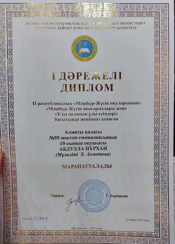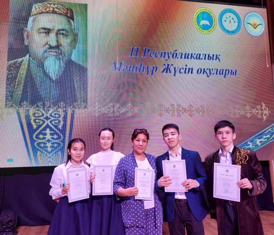 ІІ Республикалық «Мәшһүр Жүсіп оқуларының» Мәшһүр Жүсіп шығармалары және «Ұлы даланың ұлы есімдері» бағытында жеңімпаз атанған 10-сынып оқушысы Абдулла Нұрхан І дәрежелі дипломмен марапатталды. Жетекшісі: қазақ тілі мен әдебиеті пәні мұғалімі Ахметова Хабира Берікболқызы.