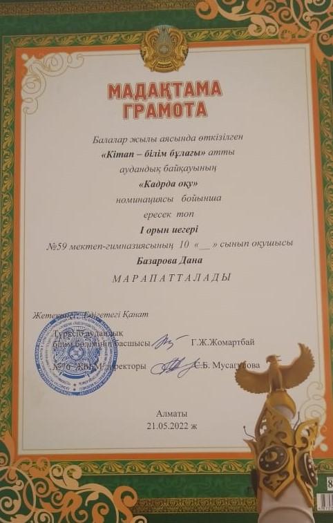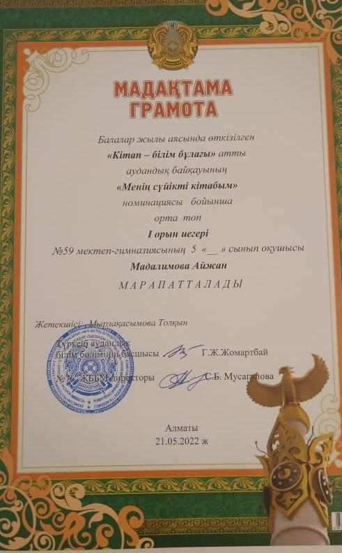 Білімнің негізгі қайнар көзі - кітапта. Сарайыңды ашып, санаңды толықтыратын да кітап. Жақында "Кітап- білім бұлағы" атты аудандық байқауы өтті. Байқау 6 бағыттан құралды. Байқауға кітап оқуға құмар жас жеткіншектер қатысты. Әр бағыт өз ерекшелігімен баланың білімін тексеруге арналған тапсырмалардан тұрды. Ауданның 27 мектебінің ішінен мектебіміздің оқушылары суырылып алға шықты. Атап өтсек, "Әдеби қолтырауын" номинациясы бойынша 6-сынып оқушысы Мұхтар Әлімқожа ІІ орынды қанжығасына байлады. "Менің сүйікті кітабым"номинациясы бойынша 5-сынып оқушысы Мадалимова Айжан І орынды иеленді. Ал "Кадрда оқу" номинациясы бойынша 10- сынып оқушысы Базарова Дана І орын алып, байқаудың қалалық кезеңіне жолдама алды. Оқушыларымызды мәртебелі жетістіктерімен құттықтай отырып, осы үрдісті әдетті бастамаға айналса екен деп тілейміз.