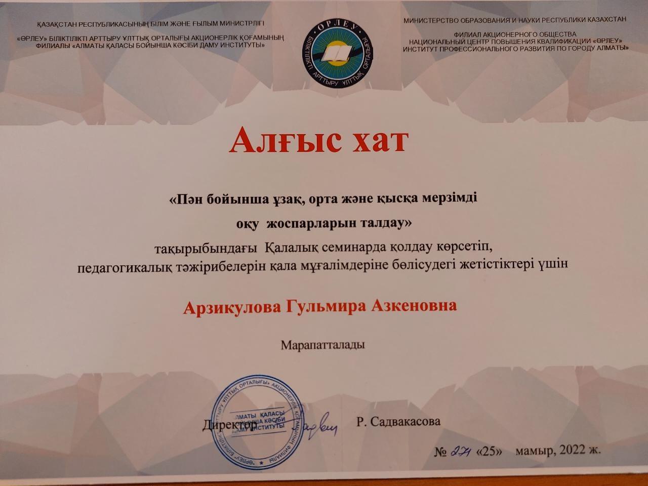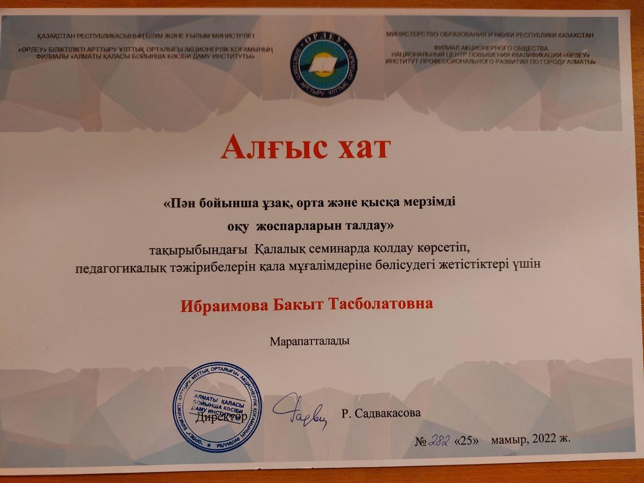Алматы қаласы «Өрлеу» біліктілікті арттыру ұлттық орталығы мектебіміздің биология пәні мұғалімі Ибраимова Бақыт Тасболатқызы мен география пәні мұғалімі Арзикулова Гүлмира Азкенқызын «Пән бойынша ұзақ, орта және қысқа мерзімді оқу жоспарларын талдау» тақырыбындағы Қалалық семинарда қолдау көрсетіп, педагогикалық тәжірибелерін қала мұғалімдеріне бөлісудегі жетістіктері үшін Алғыс хатпен марапатталды. Құтты болсын, дейміз. Ұлағатты ұстаздарымыздың педагогикалық тәжірибелері қала мұғалімдерінің игілігіне айнала берсін.