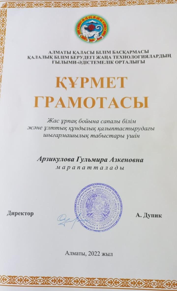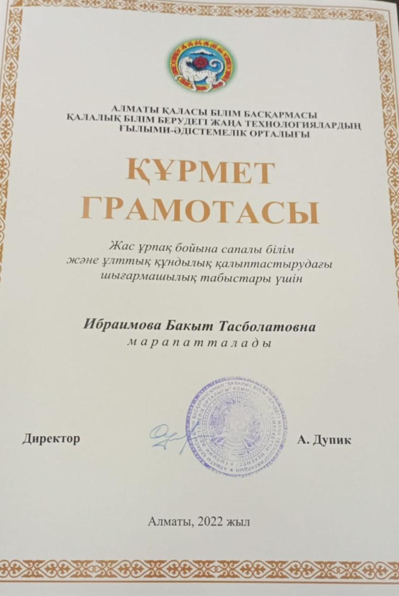 Алматы қаласы Білім басқармасы қалалық білім берудегі жаңа технологиялардың ғылыми әдістемелік орталығының директоры А.Дупик мектебіміздің ұлағатты ұстаздары Ибраимова Бақыт Тасболатқызы мен Арзикулова Гүлмира Азкенқызын жас ұрпақ бойына сапалы білім және ұлттық құндылық қалыптастырудағы шығармашылық табыстары үшін Құрмет грамотасымен марапаттады. Әріптестерімізді құттықтаймыз!