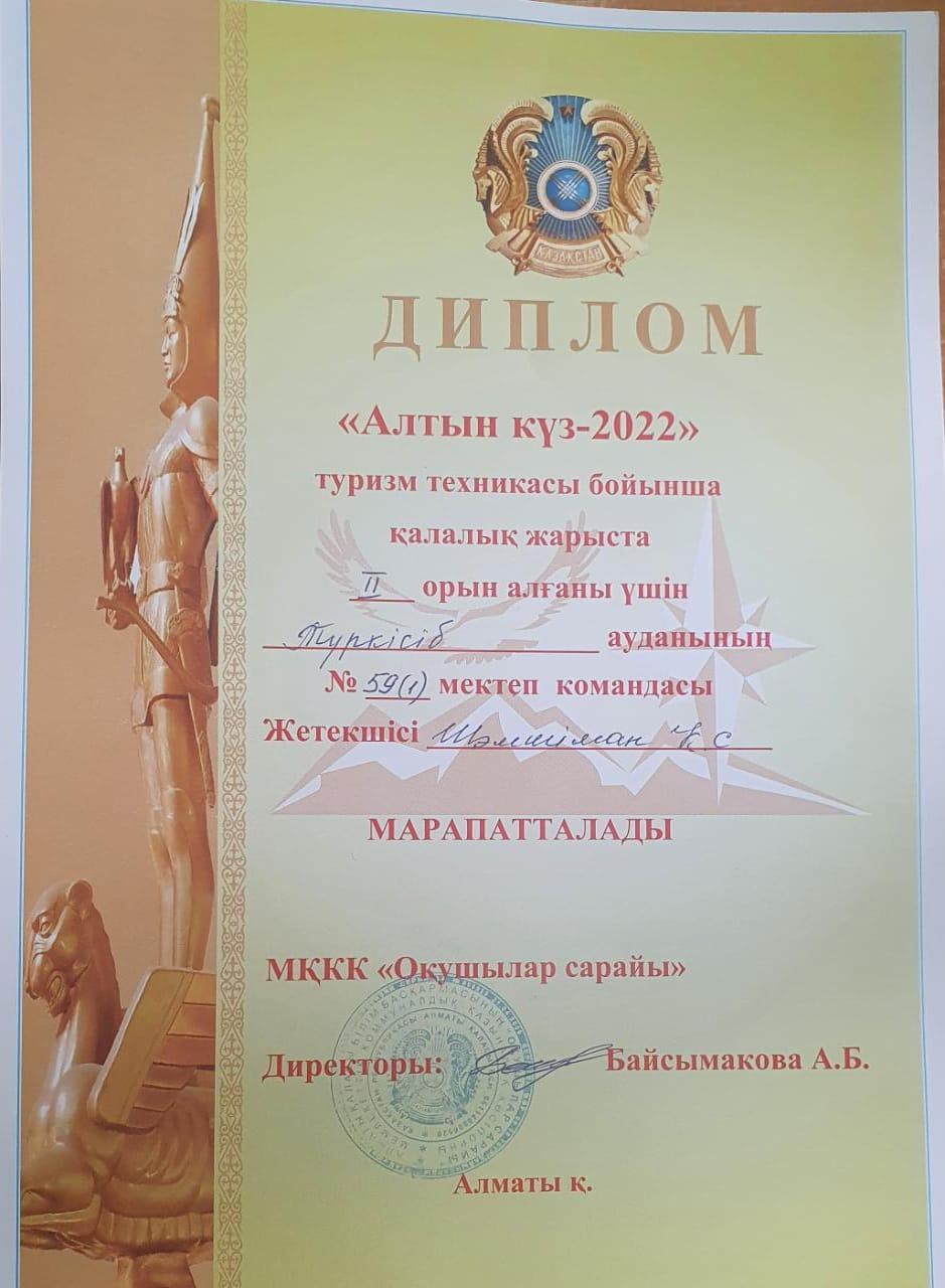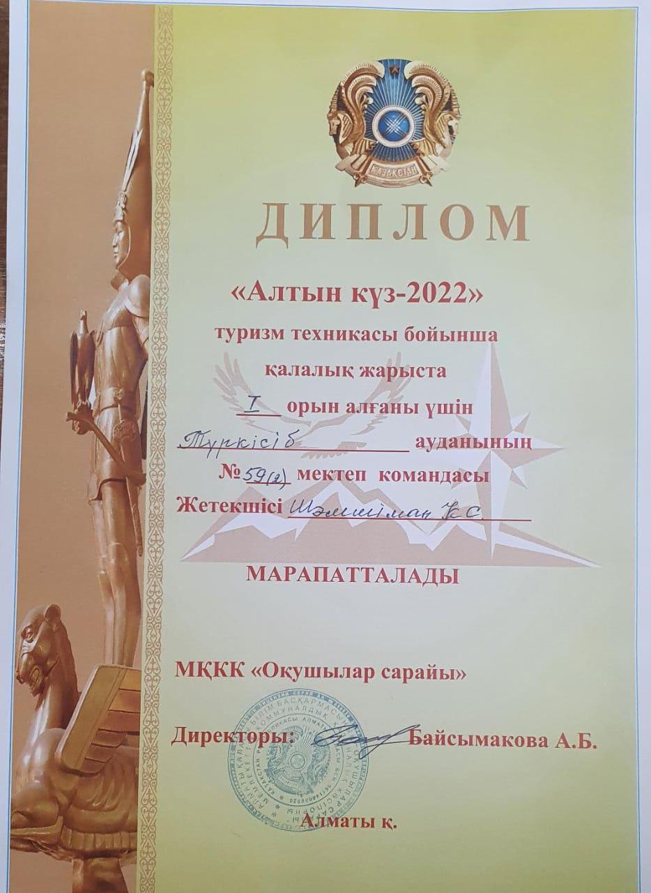 Алматы қалалық «Оқушылар сарайының» ұйымдастыруымен «Алтын күз – 2022» туризм техникасы бойынша өткен жарыста біздің балаларымыз қалалық кезеңде топ жарып, командалық есеп бойынша І-ші және ІІ-ші орындарды жеңіп алды. Жетекшісі: Шәмшіман К.С. Жарайсыңдар дейміз. Білім бағытында ғана емес, спорт, туризм бағытында да үздік атанып, биіктен көрініп жатқан оқушыларымызға және дайындап жүрген жетекшісіне ризашылығымызды білдіреміз.