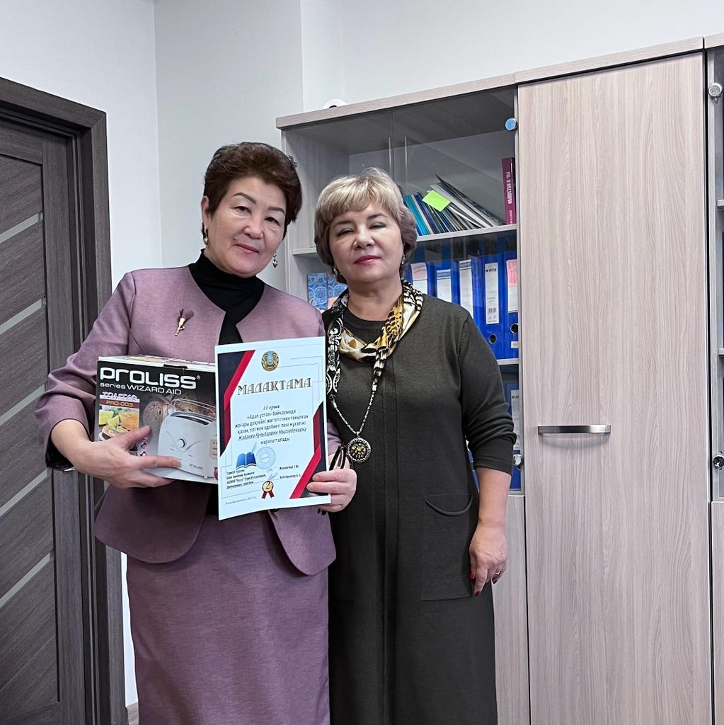 Ұлағатты әріптесіміз, қазақ тілі мен әдебиеті пәні мұғалімі Жабаева Кульбаршин Мырзабековна «Адал ұстаз» байқауының аудандық кезеңіне қатысып, жоғары деңгейлі жетістік көрсеткені үшін ІІ орынға ие болды. Құтты болсын дейміз. Алдағы байқауларда биік белестерден көріне беруіне тілектестік білдіреміз.