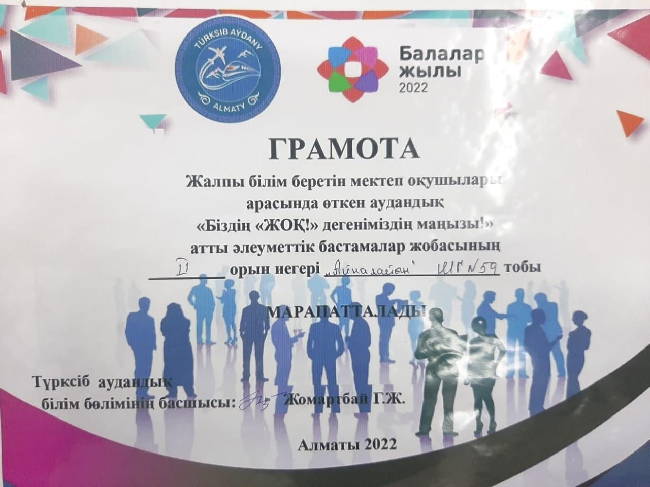 Бүгін жалпы білім беретін мектеп оқушылары арасында өткен аудандық «Біздің «Жоқ!» дегеніміздің маңызы!» атты әлеуметтік бастамалар жобасында біздің оқушыларымыз қатысып, жоғары нәтиже көрсеткені үшін жүлделі ІІ орынға ие болды. Құтты болсын дейміз. Өнері мен білімімен танылып жүрген біздің оқушыларымыз бұл байқауда да үздік екендіктерін көрсетіп, жеңімпаз болып отыр. Алдағы байқауларда да жоғары жетістіктерге жетіп, мектебіміздің абыройын асқақтата берулеріне тілектеспіз. Игі шараға жауапты: директордың тәрбие ісі жөніндегі орынбасары Әлімжан Дархан Мұхитұлы