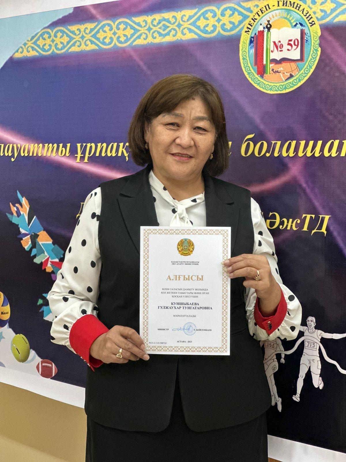 20 октябрь 2023 0 1 2 3 4 5 Мектебіміздің математика пәні мұғалімі: Кунишбаева Гүлжаухар Тунгатаровна, Оқу ағарту министрлігінің алғыс хатымен марапатталды.