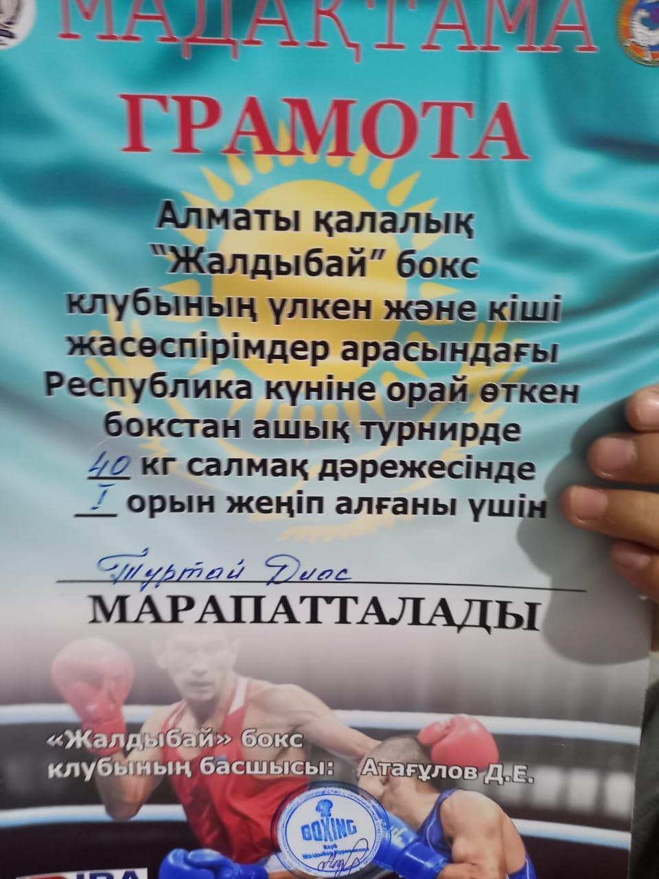 Алматы қалалық "Жалдыбай" бокс клубының үлкен және кіші жасөспірімдер арасындағы Республика күніне орай өткен бокстан ашық турнирде 40 кг салмақ дәрежесінде мектебіміздің 6а сынып оқушысы Тұртай Диас I орын жеңіп алды. Жарайсың Диас!!!