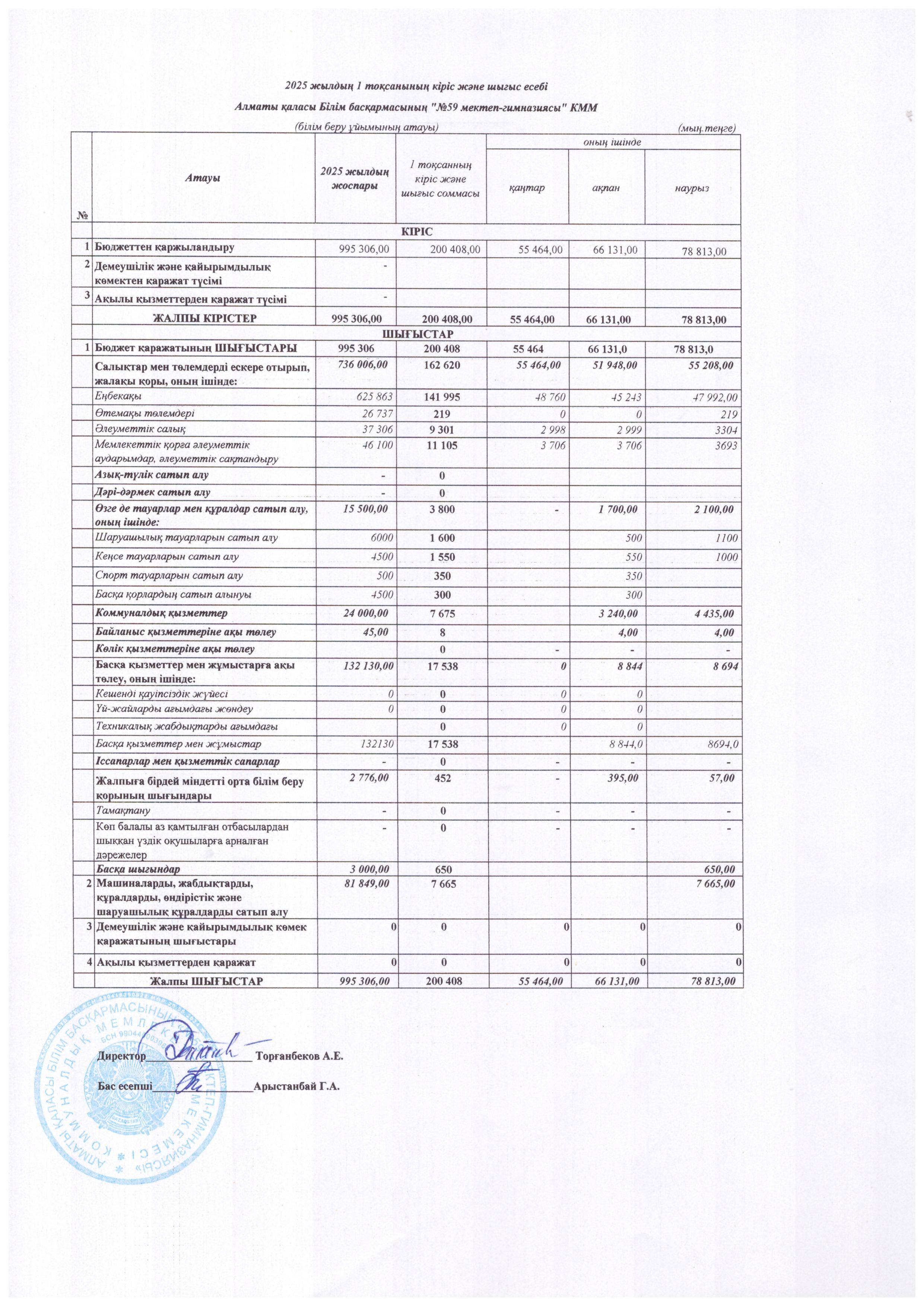 » 2025 жылдың 1 тоқсанының кіріс және шығыс есебі