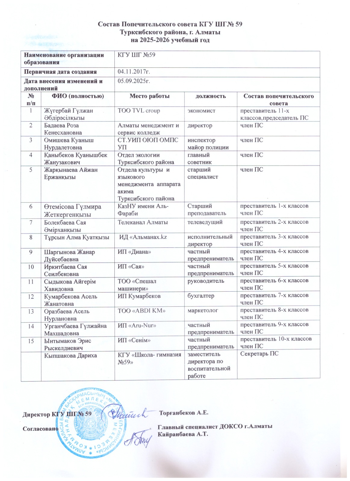 2025-2026 оқу жылына Қамқоршылық кеңесінің құрамы